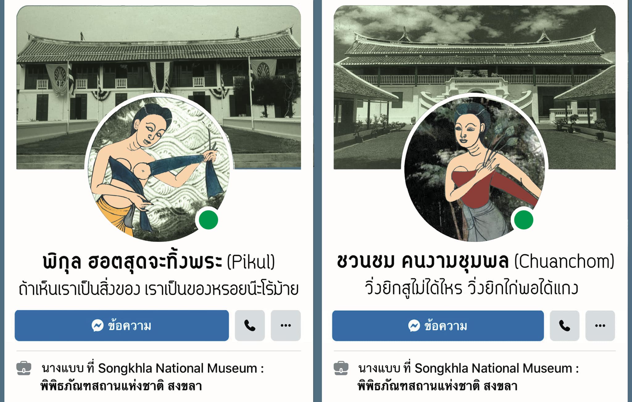 เชื่อว่าหลายท่านเคยผ่านตาภาพหญิงสาว 4 คน ที่ทางพิพิธภัณฑสถานแห่งชาติ สงขลา ได้นำมาใช้ในการออกแบบป้ายประชาสัมพันธ์หรือข้อมูลต่าง ๆ และอาจมีความสงสัยว่า แม่จ๊ะแม่จ๋า ทั้ง 4 นาง มาจากไหน มีความเป็นมาอย่างไร วันนี้จึงขอนำเสนอองค์ความรู้พิเศษเพื่อเปิดเผยที่มาของสาวงามทั้ง 4