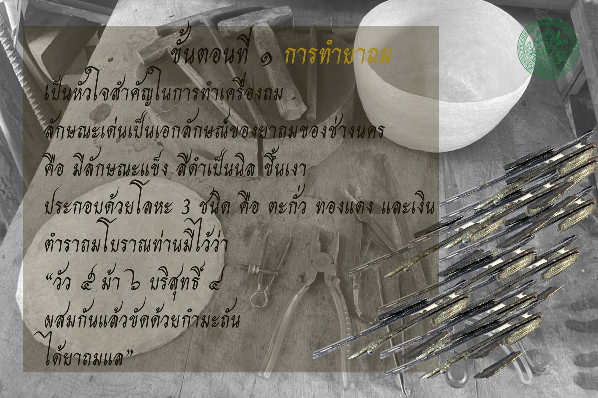 ๑.๑) การทำน้ำยาถม เป็นหัวใจสำคัญในการทำเครื่องถม ลักษณะเด่นเป็นเอกลักษณ์ของยาถมของช่างนคร คือ มีลักษณะแข็ง สีดำเป็นนิล ขึ้นเงา ประกอบด้วยโลหะ ๓ ชนิด คือ ตะกั่ว ทองแดง และเงิน ตำราถมโบราณท่านมีไว้ว่า “วัว ๕ ม้า ๖ บริสุทธิ์ ๔ ผสมกันแล้วขัดด้วยกำมะถัน ได้ยาถมแล”