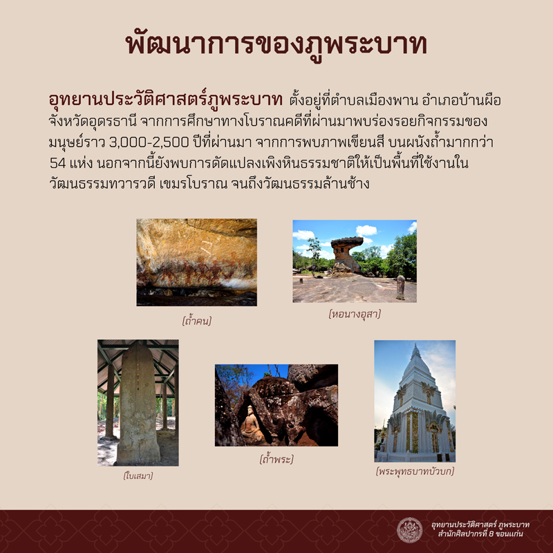 อุทยานประวัติศาสตร์ตั้งอยู่ที่ตำบลเมืองพาน อำเภอบ้านผือ จังหวัดอุดรธานี จากการศึกษาทางโบราณคดีที่ผ่านมา พบว่าภูพระบาทได้ปรากฏร่องรอยกิจกรรมของมนุษย์ยุคก่อนประวัติศาสตร์เมื่อราว 3,000 – 2,500 ปีมาแล้ว จากการพบภาพเขียนสีบนเพิงผาและผนังถ้ำมากกว่า 54 แห่งบนภูเขาแห่งนี้ นอกจากนี้ยังพบการดัดแปลงเพิงหินธรรมชาติให้เป็นพื้นที่ใช้งานในวัฒนธรรมทวารวดี เขมรโบราณ จนถึงวัฒนธรรมล้านช้าง ซึ่งหลักฐานทางโบราณคดีเหล่านี้ แสดงให้เห็นพัฒนาการทางสังคม และวัฒนธรรมของ ภูพระบาทได้เป็นอย่างดี