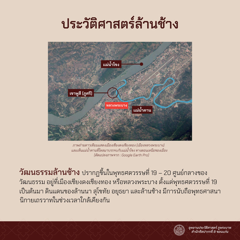 วัฒนธรรมล้านช้างปรากฏขึ้นในช่วงพุทธศตวรรษที่ 19 – 20 ศูนย์กลางของวัฒนธรรมอยู่ที่เมืองเชียงดงเชียงทอง หรือหลวงพระบาง โดยมีแม่น้ำคานไหลสู่แม่น้ำโขงและมีพูสี (ภูศรี) เป็นภูเขาศักดิ์สิทธิ์ประจำเมืองตามคติศูนย์กลางจักรวาล ซึ่งนิยมสร้างพระธาตุเจดีย์บนยอดเขา ตั้งแต่ช่วงพุทธศตวรรษที่ 19 เป็นต้นมาดินแดนของล้านนา สุโขทัย อยุธยา และล้านช้าง มีการนับถือพุทธศาสนานิกายเถรวาทในช่วงเวลาใกล้เคียงกัน สำหรับอาณาจักรล้านช้างนั้นพงศาวดารล้านช้างได้กล่าวว่า พระยาฟ้างุ้มลี้ภัยไปยังอินทปัตต์นคร (พระนครหลวงของกัมพูชา) และกลับมาพร้อมพระมหาเถรปาสมันต์ โดยอัญเชิญพระบางพระพุทธรูปองค์สำคัญมาด้วย และได้ประดิษฐานไว้ที่เมืองเวียงคำ จนถึงรัชกาลพระยาวิชุนราชจึงอัญเชิญขึ้นมาประดิษฐาน ณ เมืองเชียงดงเชียองทอง นับเป็นจุดเริ่มต้นของพุทธศาสนานิกายเถรวาทในอาณาจักรล้านช้าง