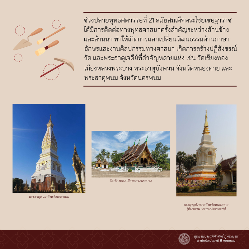 ช่วงปลายพุทธศตวรรษที่ 21 สมัยสมเด็จพระไชยเชษฐาราช ได้มีการติดต่อทางพุทธศาสนาครั้งสำคัญระหว่างล้านช้างและล้านนา ทำให้เกิดการแลกเปลี่ยนวัฒนธรรมด้านภาษา อักษร และงานศิลปกรรมทางศาสนา เกิดการสร้าง ปฏิสังขรณ์วัด และพระธาตุเจดีย์ที่สำคัญหลายแห่ง เช่น วัดเชียงทอง เมืองหลวง พระบาง พระธาตุบังพวน จังหวัดหนองคาย และพระธาตุพนม จังหวัดนครพนม
