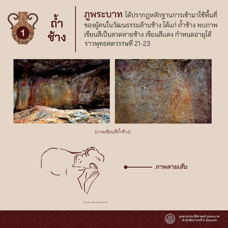 1. ถ้ำช้าง มีลักษณะเป็นเพิงหินขนาดใหญ่ 2 ก้อนซ้อนกัน ตั้งอยู่บนลานพื้นหินที่ยกตัวสูงขึ้น โดยพบภาพจิตรกรรมฝาผนังทางทิศตะวันออกเฉียงเหนือของตัวถ้ำ เขียนสีแดงเป็นลวดลายช้าง ลายเส้นดูอ่อนช้อย สันนิษฐานว่าเขียนขึ้นในช่วงวัฒนธรรมล้านช้าง ราวพุทธศตวรรษที่ 21 – 23