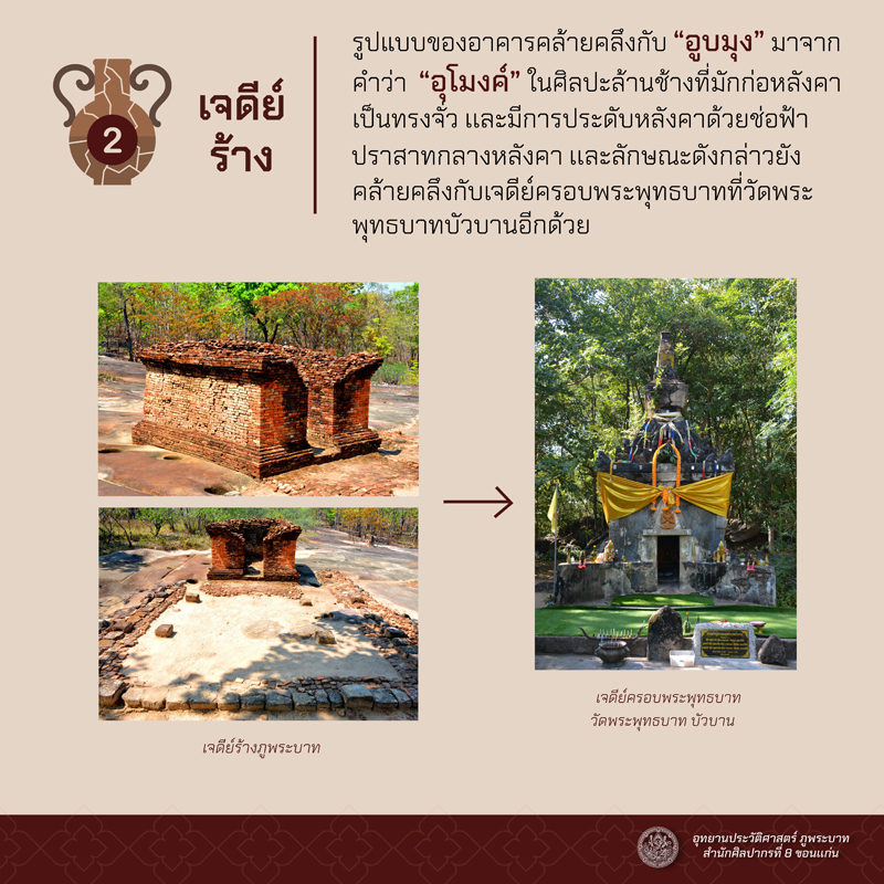 2. เจดีย์ร้าง ผู้คนในท้องถิ่นเรียกเจดีย์ดังกล่าวว่า อูปโมงค์ ลักษณะเป็นอาคารทรงสี่เหลี่ยมก่อผนังอิฐทึบ 3 ด้าน มีประตูทางเข้า 1 ด้าน ตั้งอยู่บนลานหิน สันนิษฐานว่าเคยเป็นที่ประดิษฐานรอยพระพุทธบาท รูปแบบของอาคารคล้ายคลึงกับอูบมุง มาจากคำว่าอุโมงค์ ในศิลปะล้านช้างที่มักก่อหลังคาเป็นทรงจั่ว และมีการประดับหลังคาด้วยช่อฟ้าปราสาทกลางหลังคา และลักษณะดังกล่าวยังคล้ายคลึงกับเจดีย์ครอบพระพุทธบาทที่วัดพระพุทธบาทบัวบานอีกด้วย รูปแบบเช่นนี้มีลักษณะเป็นคันธกุฎี หรือกุฎิส่วนพระองค์ของพระพุทธเจ้า ถูกระบุในวินัยว่าเป็นสถานที่สำราญพระสรีระของพระพุทธเจ้าโดยเฉพาะ จึงสร้างให้พอดีกับพระพุทธรูปองค์เดียว