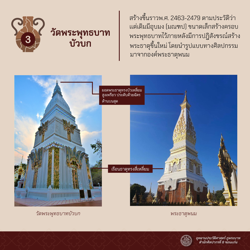 3. วัดพระพุทธบาทบัวบก ตามประวัติว่าแต่เดิมมีอุบมง (มณฑป) ขนาดเล็กสร้างครอบพระพุทธบาทไว้ ต่อมาเมื่อปี พ.ศ.2463 พระอาจารย์สีทัตถ์ สุวรรณมาโจ ได้ธุดงค์มาพบจึงได้ปฏิสังขรณ์สร้างพระธาตุครอบใหม่ดังปรากฏในปัจจุบัน โดยเสร็จสิ้นราวพ.ศ. 2479 ซึ่งนำรูปแบบทางศิลปกรรมมาจากองค์พระธาตุพนม คือ เป็นพระธาตุทรงเหลี่ยมฐานกว้างด้านละ 8.50 เมตร สูงประมาณ 45 เมตร ส่วนฐานชั้นล่างก่อเป็นห้อง สามารถเข้าไปนมัสการรอยพระพุทธบาทได้ ส่วนยอดพระธาตุทรงบัวเหลี่ยมสูงเพรียว ประดับด้วยฉัตร 9 ชั้น ในส่วนยอดประดิษฐานพระบรมสารีริกธาตุที่ขุดพบในรอยพระพุทธบาทเดิม