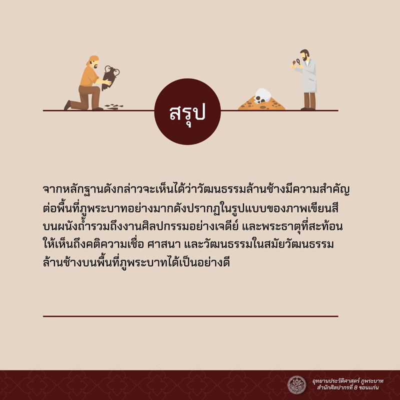 จากหลักฐานดังกล่าวจะเห็นได้ว่าวัฒนธรรมล้านช้างมีความสำคัญต่อพื้นที่ภูพระบาทอย่างมาก ดังปรากฏในรูปแบบของภาพเขียนสีบนผนังถ้ำ รวมถึงงานศิลปกรรมอย่างเจดีย์ และพระธาตุที่สะท้อนให้เห็นถึงคติความเชื่อ ศาสนา และวัฒนธรรมในสมัยวัฒนธรรมล้านช้างบนพื้นที่ภูพระบาทได้เป็นอย่างดี
