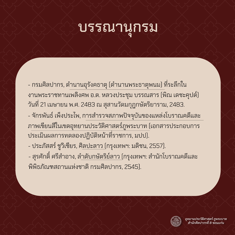 กรมศิลปากร, ตำนานอุรังคธาตุ (ตำนานพระธาตุพนม) ที่ระลึกในงานพระราชทานเพลิงศพ อ.ต. หลวงประชุม บรรณสาร (พิณ เดชะคุปต์) วันที่ 21 เมษายน พ.ศ. 2483 ณ สุสานวัดมกุฎกษัตริยาราม , 2483. จักรพันธ์ เพ็งประไพ, การสำรวจสภาพปัจจุบันของแหล่งโบราณคดีและภาพเขียนสีในเขตอุทยาน ประวัติศาสตร์ภูพระบาท (เอกสารประกอบการประเมินผลการทดลองปฏิบัติหน้าที่ราชการ, มปป). ประภัสสร์ ชูวิเชียร, ศิลปะลาว (กรุงเทพฯ: มติชน, 2557). สุรศักดิ์ ศรีสำอาง, ลำดับกษัตริย์ลาว (กรุงเทพฯ: สำนักโบราณคดีและพิพิธภัณฑสถานแห่งชาติ กรมศิลปากร, 2545).