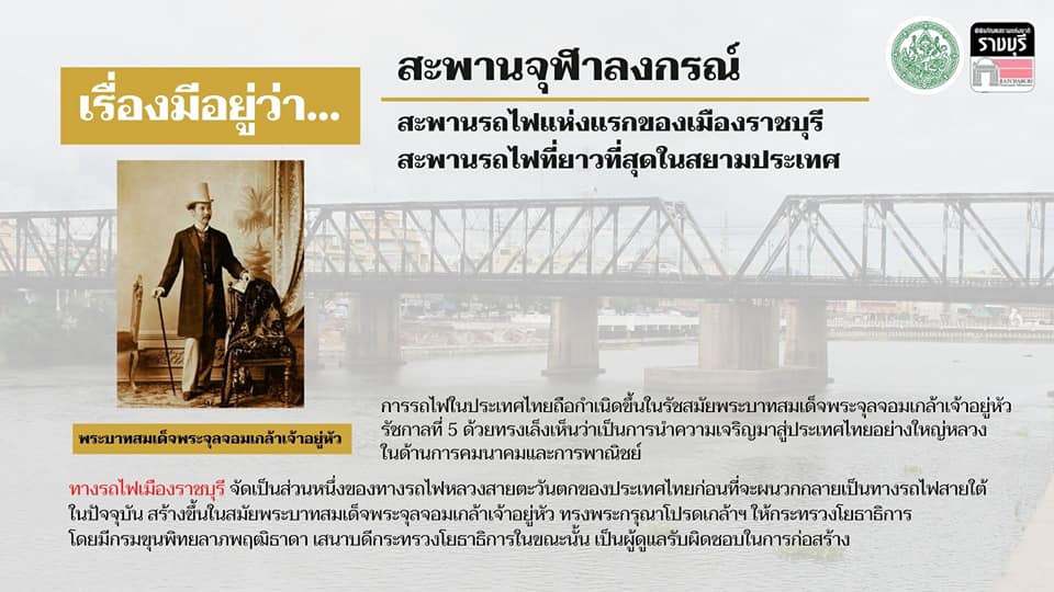สะพานข้ามแม่น้ำแม่กลองช่วงผ่านเมืองราชบุรีสร้างเมื่อ พ.ศ. 2444 ทางเดินรถแบ่งเป็น 3 ช่วง ช่วงละ 50 เมตร มีระยะทางทั้งสิ้น 150 เมตร นับได้ว่าเป็นสะพานรถไฟที่ยาวที่สุดของสยามประเทศ ในเวลานั้น พระบาทสมเด็จพระจุลจอมเกล้าเจ้าอยู่หัว ได้ทรงพระราชทานชื่อว่า #สะพานจุฬาลงกรณ์ ตามพระนามของพระองค์ และได้เสด็จพระราชดำเนินทรงเปิดทางรถไฟอย่างเป็นทางการเมื่อวันที่ 19 มิถุนายน 2446