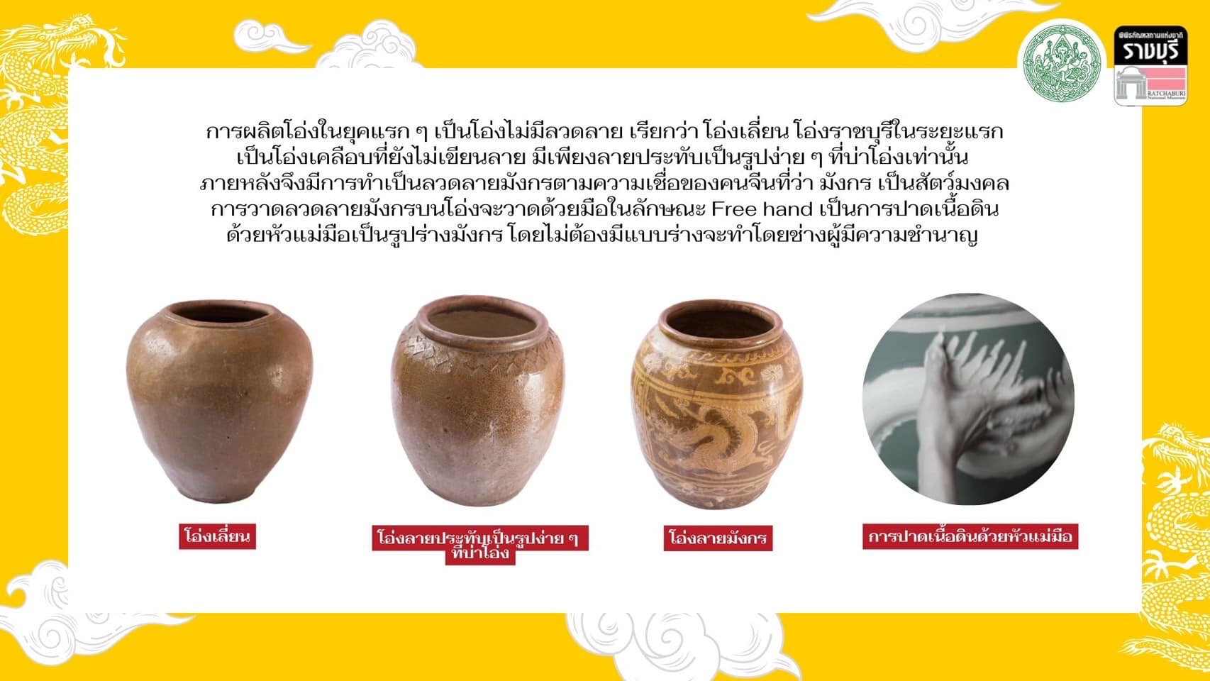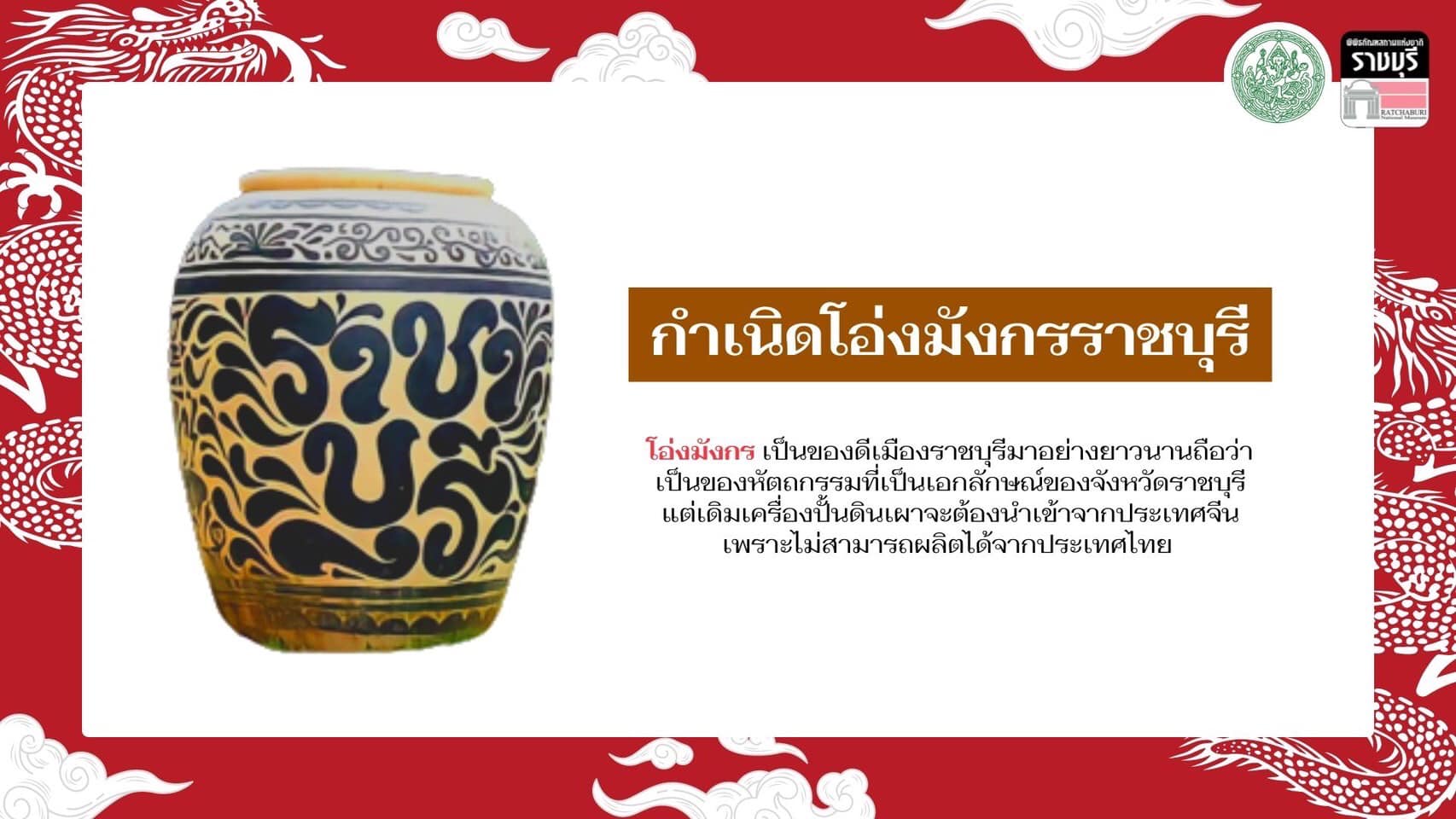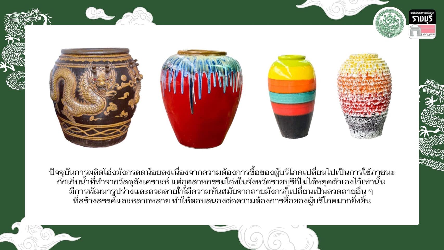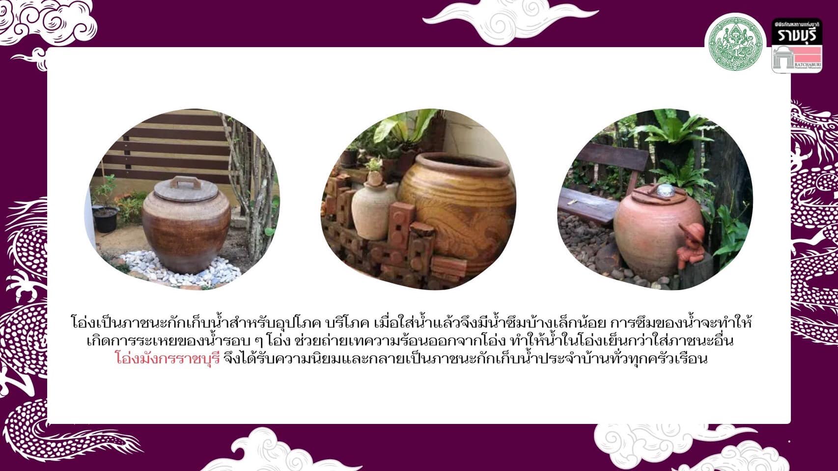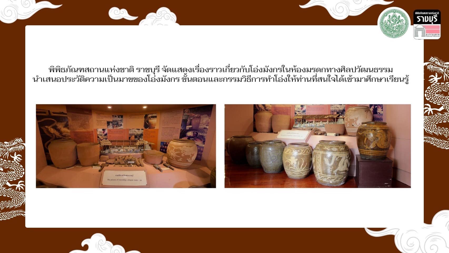 พิพิธภัณฑสถานแห่งชาติ ราชบุรี จัดแสดงเรื่องราวเกี่ยวกับโอ่งมังกรในห้องมรดกทางศิลปวัฒนธรรม นำเสนอประวัติความเป็นมาของโอ่งมังกร ขั้นตอนและกรรมวิธีการทำโอ่งให้ท่านที่สนใจได้เข้ามาศึกษาเรียนรู้