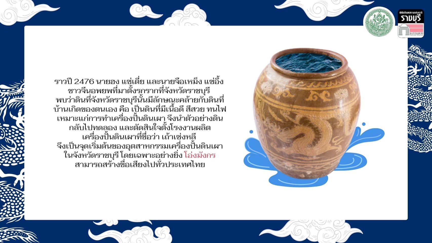 ราวปี 2476 นายฮง แซ่เตี่ย และนายจือเหม็ง แซ่อึ้ง ชาวจีนอพยพที่มาตั้งรกรากที่จังหวัดราชบุรี พบว่าดินที่จังหวัดราชบุรีนั้น มีลักษณะคล้ายกับดินที่บ้านเกิดของตนเอง คือ เป็นดินที่มีเนื้อดี สีสวย ทนไฟ เหมาะแก่การทำเครื่องปั้นดินเผา จึงนำตัวอย่างดินกลับไปทดลอง และตัดสินใจตั้งโรงงานผลิตเครื่องปั้นดินเผาที่ชื่อว่า เถ้าเซ่งหลี เป็นจุดเริ่มต้นของอุตสาหกรรมเครื่องปั้นดินเผาในจังหวัดราชบุรี โดยเฉพาะอย่างยิ่ง #โอ่งมังกร สามารถสร้างชื่อเสียงไปทั่วประเทศ