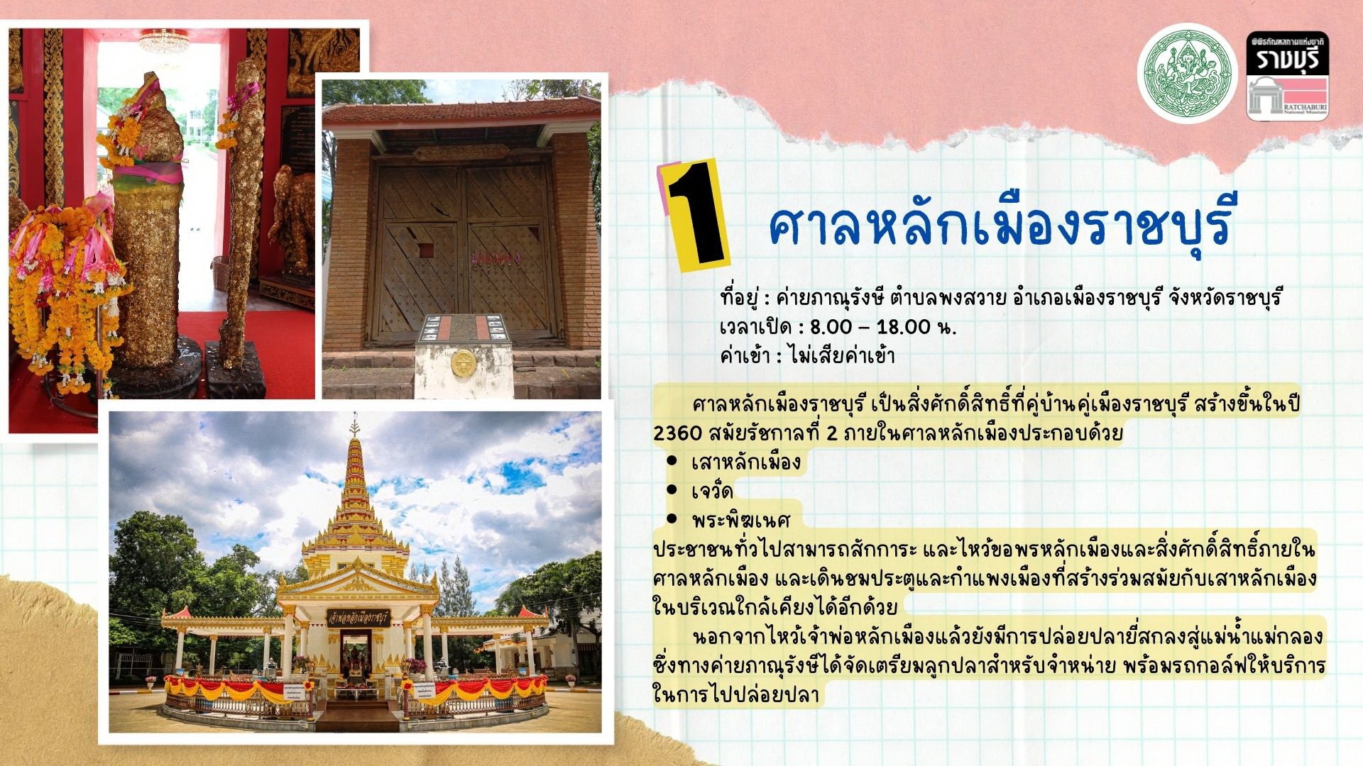 ศาลหลักเมืองราชบุรี เป็นสิ่งศักดิ์สิทธิ์ที่คู่บ้านคู่เมืองราชบุรี สร้างขึ้นในปี 2360 สมัยรัชกาลที่ 2 ภายในศาลหลักเมืองประกอบด้วย เสาหลักเมือง, เจว็ด, พระพิฆเนศ ประชาชนทั่วไปสามารถสักการะ และไหว้ขอพรหลักเมืองและสิ่งศักดิ์สิทธิ์ภายในศาลหลักเมือง และเดินชมประตูและกำแพงเมืองที่สร้างร่วมสมัยกับเสาหลักเมืองในบริเวณใกล้เคียงได้อีกด้วย