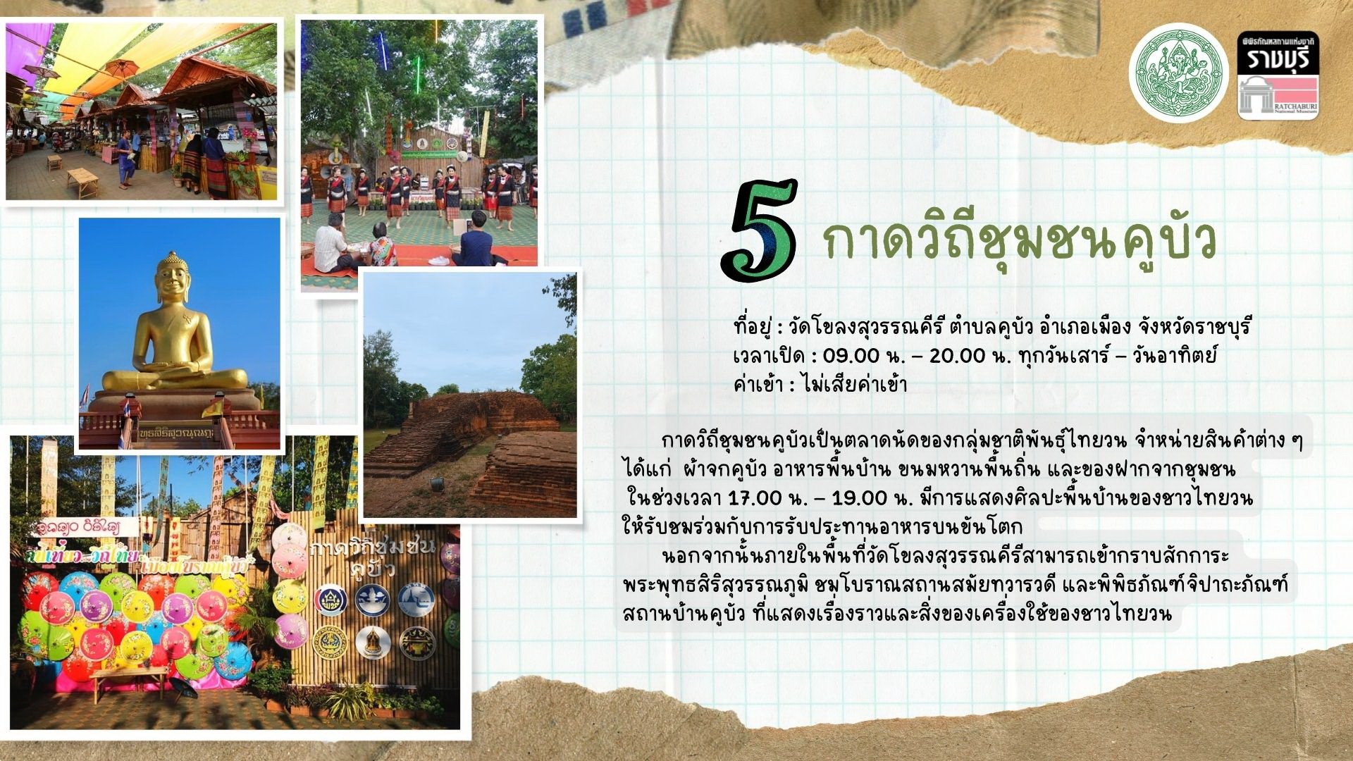 กาดวิถีชุมชนคูบัวเป็นตลาดนัดของกลุ่มชาติพันธุ์ไทยวน จำหน่ายสินค้าต่าง ๆ ได้แก่ ผ้าจกคูบัว อาหารพื้นบ้าน ขนมหวานพื้นถิ่น และของฝากจากชุมชน ในช่วงเวลา 17.00 น. – 19.00 น. มีการแสดงศิลปะพื้นบ้านของชาวไทยวนให้รับชมร่วมกับการรับประทานอาหารบนขันโตก