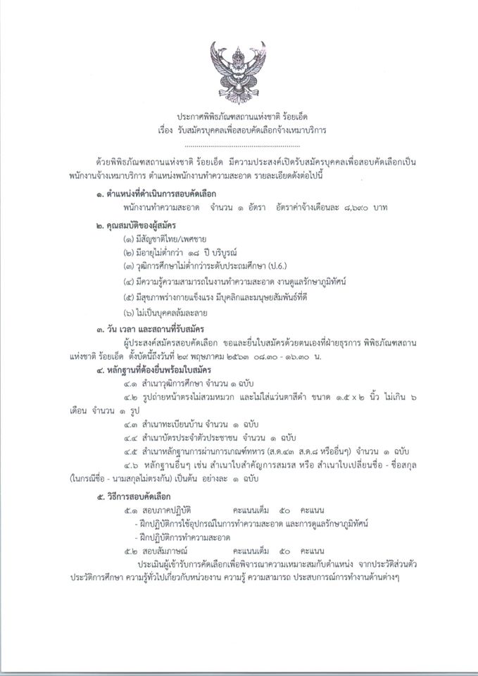 พิพิธภัณฑสถานแห่งชาติ ร้อยเอ็ด รับสมัครงานจ้างเหมาบริการตำแหน่งพนักงานทำความสะอาด จำนวน ๑ อัตรา