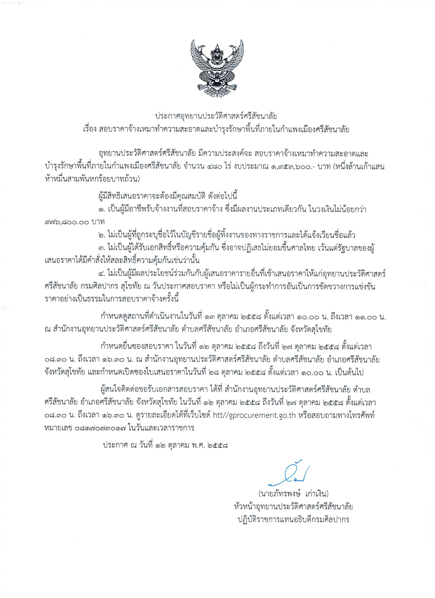 ประกาศอุทยานประวัติศาสตร์ศรีสัชนาลัย เรื่อง สอบราคาจ้างเหมาทำความสะอาดและบำรุงรักษาพื้นที่ภายในกำแพงเมืองศรีสัชนาลัย เลขที่ 1/2559