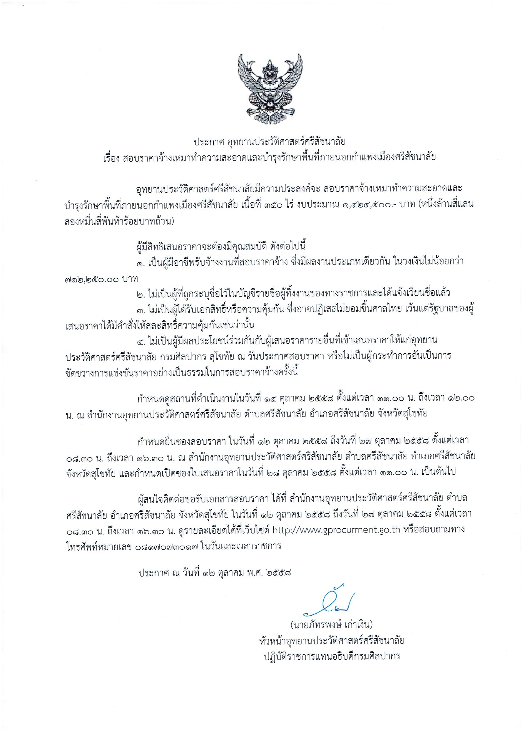 ประกาศอุทยานประวัติศาสตร์ศรีสัชนาลัย เรื่อง สอบราคาจ้างเหมาทำความสะอาดและบำรุงรักษาพื้นที่ภายนอกกำแพงเมืองศรีสัชนาลัย เลขที่ 2/2559