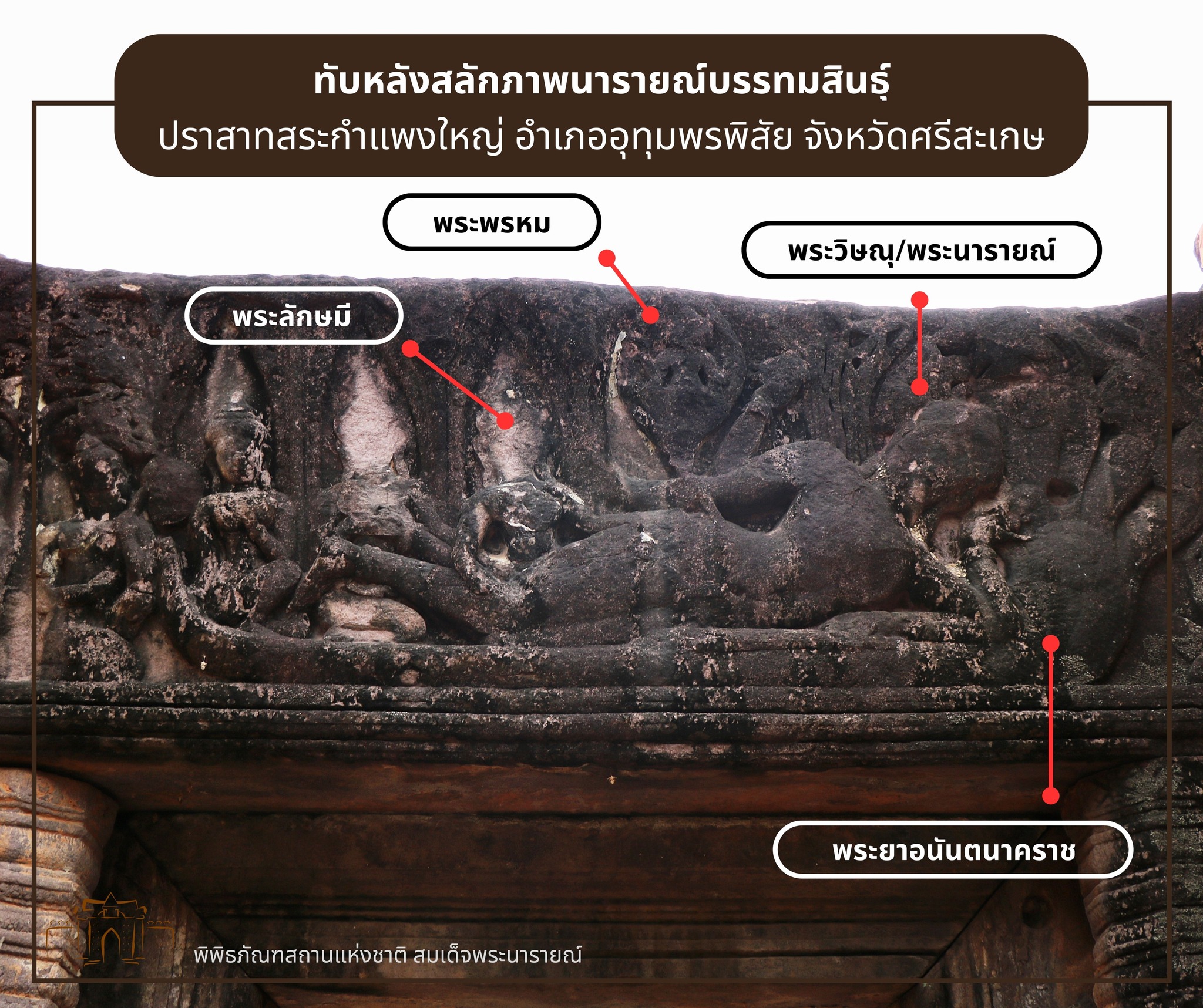 ทับหลังสลักภาพนารายณ์บรรทมสินธุ์ในพิพิธภัณฑสถานแห่งชาติ สมเด็จพระนารายณ์ ว่าด้วยเรื่องราวของพระวิษณุหรือพระนารายณ์ เทพเจ้าผู้ทำหน้าที่รักษาความสงบสุขของโลก ตามคัมภีร์ในศาสนาฮินดูกล่าวว่า การบรรทมของพระวิษณุเกิดขึ้นเมื่อโลกถูกทำลาย บรรดาเหล่าพรหมและฤษีได้ขอให้พระวิษณุสร้างโลกขึ้นใหม่ พระวิษณุจึงกระทำโยคนิทราระหว่างบรรทมเหนือพระยาอนันตนาคราชกลางเกษียรสมุทร และบังเกิดดอกบัวผุดขึ้นจากพระนาภี (สะดือ) ซึ่งมีพระพรหมประทับอยู่บนนั้น โดยพระพรหมจะทำหน้าที่สร้างโลกและสรรพสิ่งต่าง ๆ ขึ้นอีกครั้ง ภาพเล่าเรื่องตอนนี้นิยมสลักอยู่บนทับหลังหรือหน้าบันของปราสาทเขมร และมักจะอยู่ในตำแหน่งสำคัญของเทวสถาน