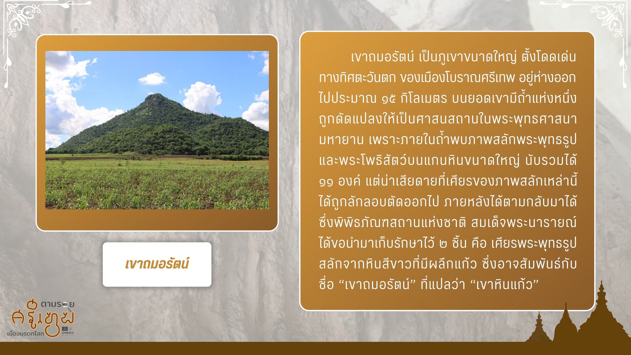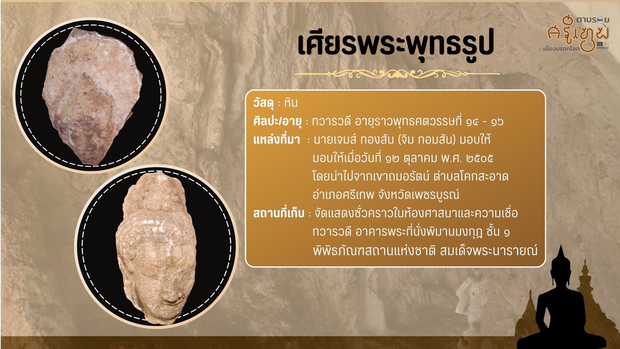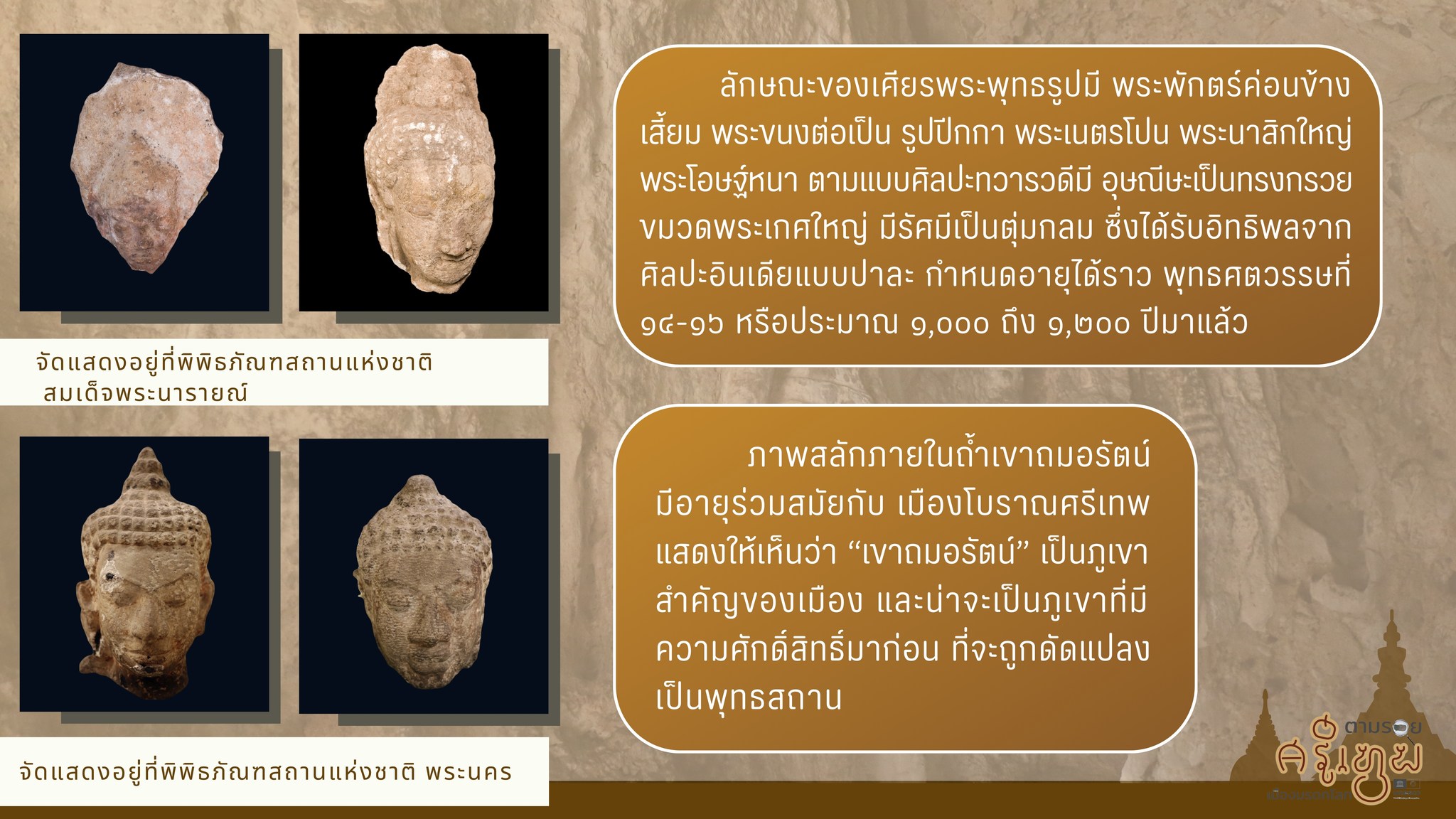 เนื่องในโอกาสที่เมืองโบราณศรีเทพได้รับการประกาศขึ้นทะเบียนเป็นมรดกโลก พิพิธภัณฑสถานแห่งชาติ สมเด็จพระนารายณ์ขอนำเสนอองค์ความรู้เกี่ยวกับโบราณวัตถุจากเมืองศรีเทพที่เก็รักษาอยู่ในพิพิธภัณฑ์ เรื่อง "เศียรพระพุทธรูปจากถ้ำเขาถมอรัตน์" ซึ่งจัดแสดงประกอบนิทรรศการตามรอยศรีเทพ เมืองมรดกโลก