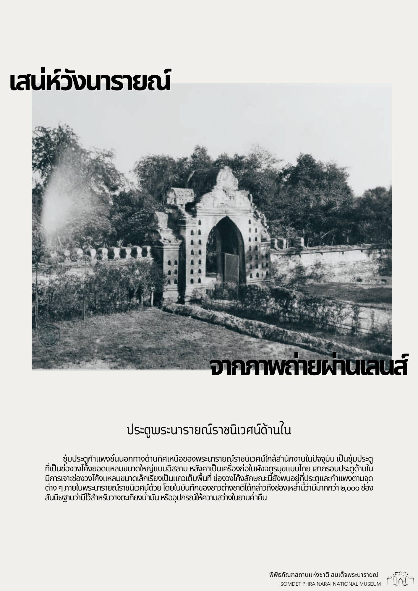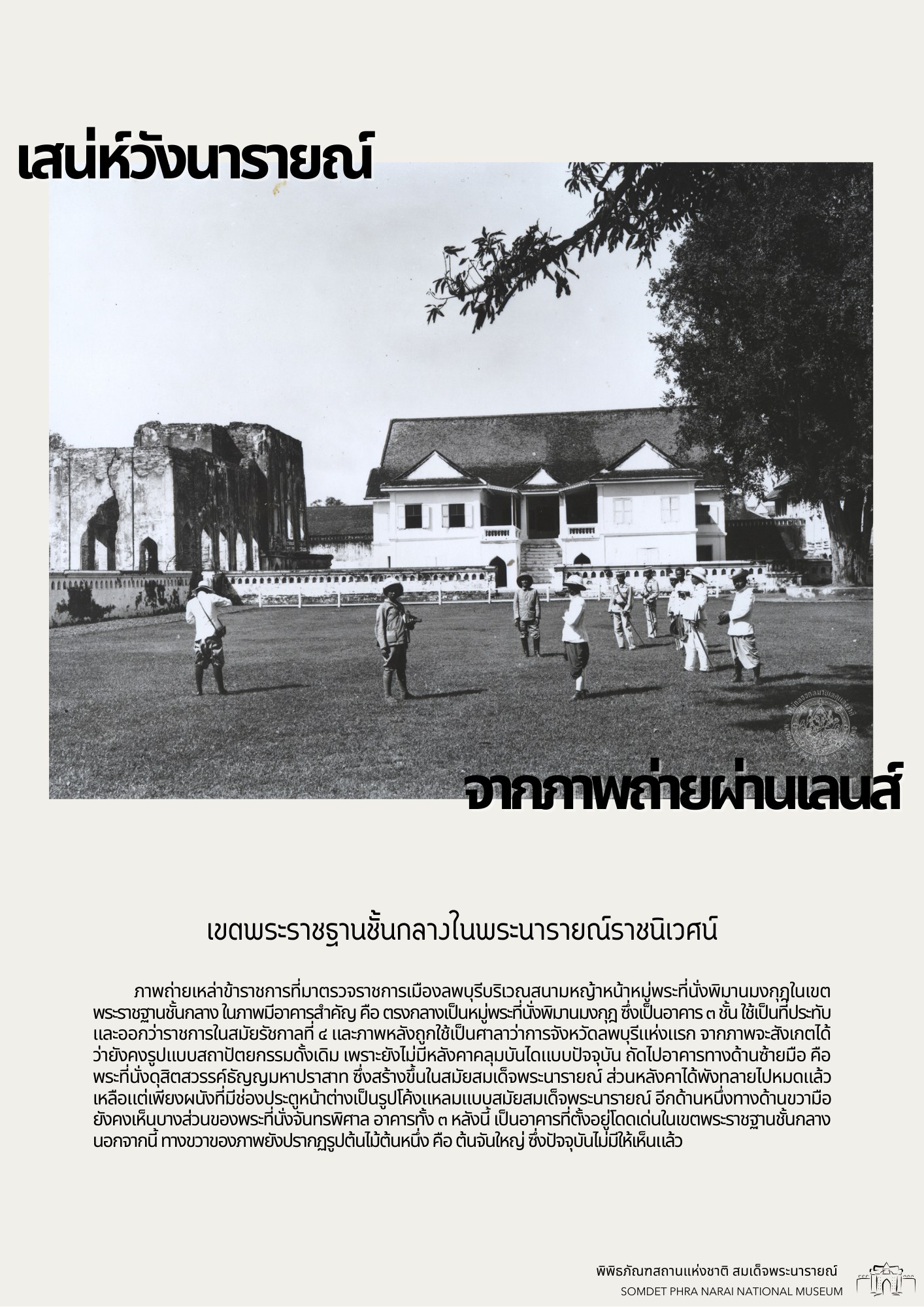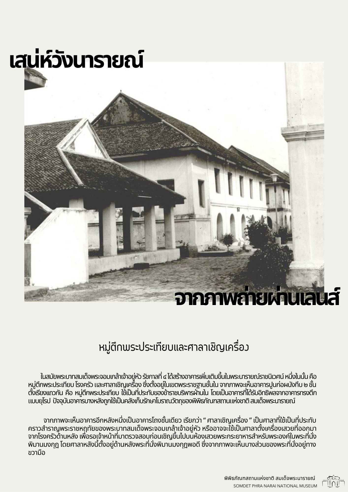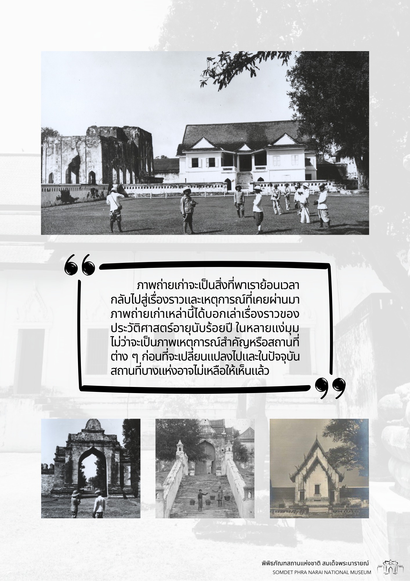 วันนี้ทางพิพิธภัณฑสถานแห่งชาติ สมเด็จพระนารายณ์ ได้รวบรวมภาพถ่ายเก่าภายในบริเวณนารายณ์ราชนิเวศน์ ซึ่งเป็นชุดภาพถ่ายเก่าที่บอกเล่าเหตุการณ์และสถานที่ในอดีตได้อย่างชัดเจน นอกจากนี้ ภาพถ่ายเก่ายังมีเนื้อหาที่แสดงให้เห็นถึงการเปลื่ยนแปลงต่าง ๆ จึงขอเชิญชวนทุกท่านมาย้อนอดีตไปกับชุดภาพถ่ายเก่าใน "เสน่ห์วังนารายณ์ จากภาพถ่ายผ่านเลนส์" เพื่อกลับไปดูบรรยากาศของวังนารายณ์ในสมัยอดีต ซึ่งจะได้เห็นสภาพพระนารายณ์ราชนิเวศน์ ขนบธรรมเนียมประเพณี วัฒนธรรมการแต่งกาย รวมไปถึงวิถีชีวิตความเป็นอยู่ที่หลากหลายมุมมองของผู้คนในยุคนั้น