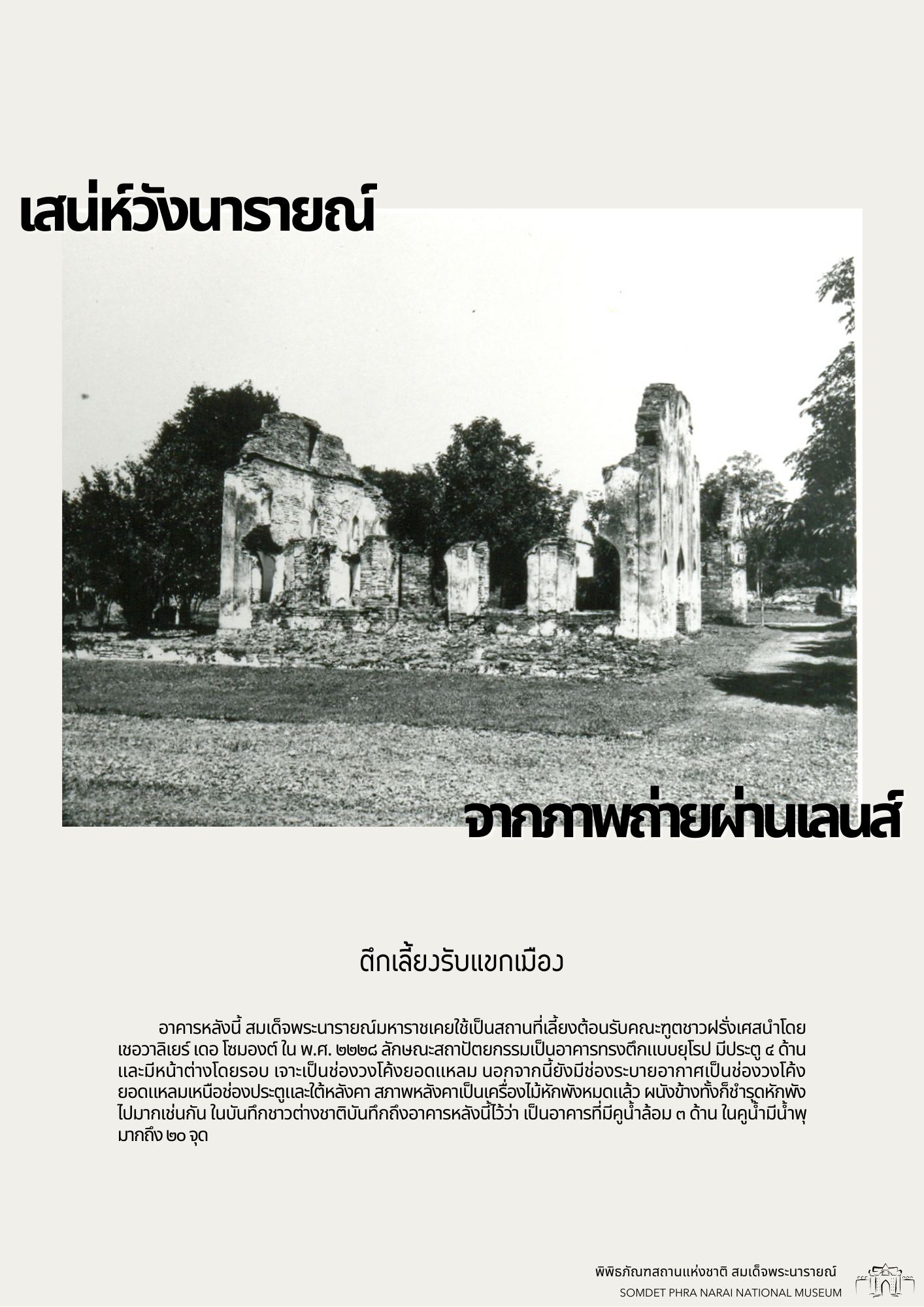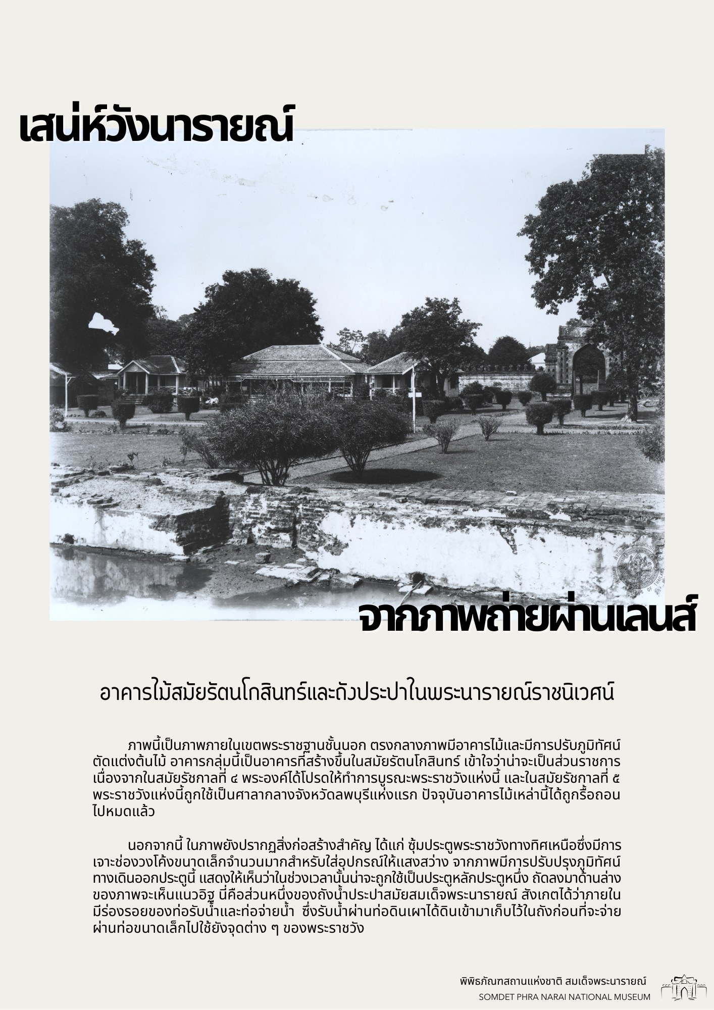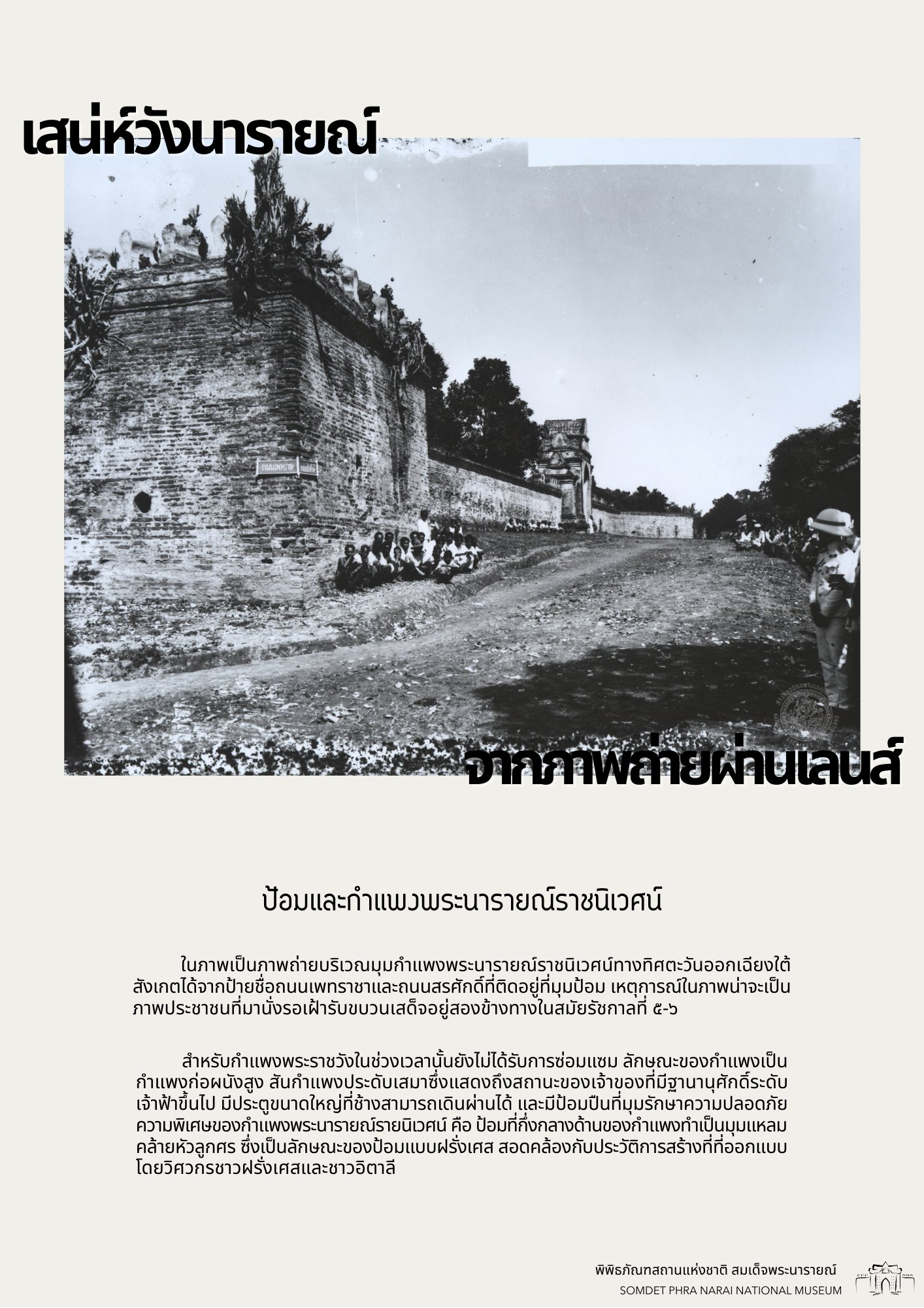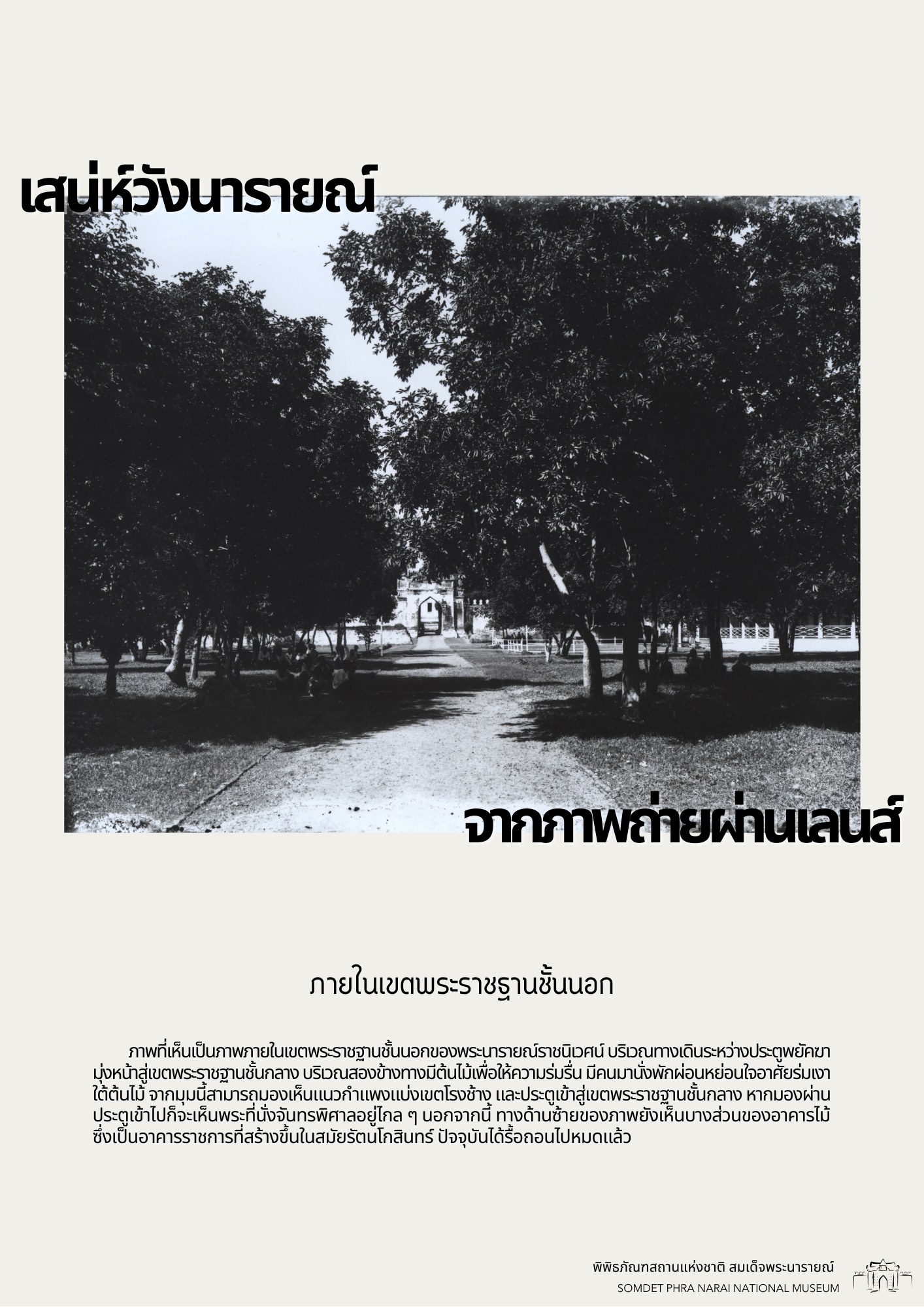 วันนี้ทางพิพิธภัณฑสถานแห่งชาติ สมเด็จพระนารายณ์ ได้รวบรวมภาพถ่ายเก่าภายในบริเวณนารายณ์ราชนิเวศน์ ซึ่งเป็นชุดภาพถ่ายเก่าที่บอกเล่าเหตุการณ์และสถานที่ในอดีตได้อย่างชัดเจน นอกจากนี้ ภาพถ่ายเก่ายังมีเนื้อหาที่แสดงให้เห็นถึงการเปลื่ยนแปลงต่าง ๆ จึงขอเชิญชวนทุกท่านมาย้อนอดีตไปกับชุดภาพถ่ายเก่าใน "เสน่ห์วังนารายณ์ จากภาพถ่ายผ่านเลนส์" เพื่อกลับไปดูบรรยากาศของวังนารายณ์ในสมัยอดีต ซึ่งจะได้เห็นสภาพพระนารายณ์ราชนิเวศน์ ขนบธรรมเนียมประเพณี วัฒนธรรมการแต่งกาย รวมไปถึงวิถีชีวิตความเป็นอยู่ที่หลากหลายมุมมองของผู้คนในยุคนั้น