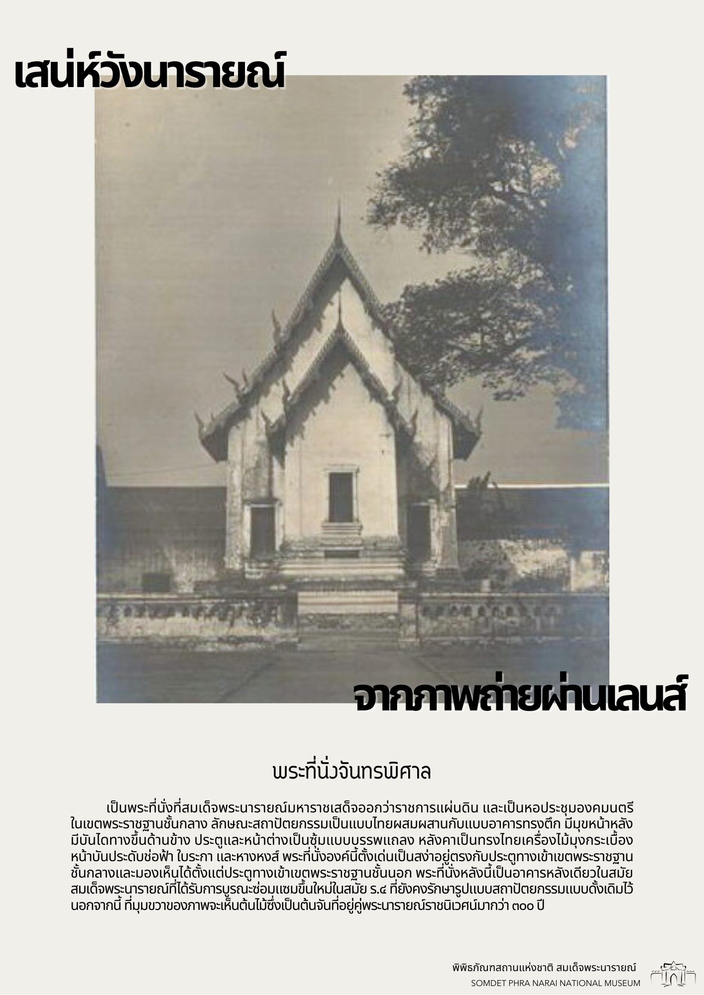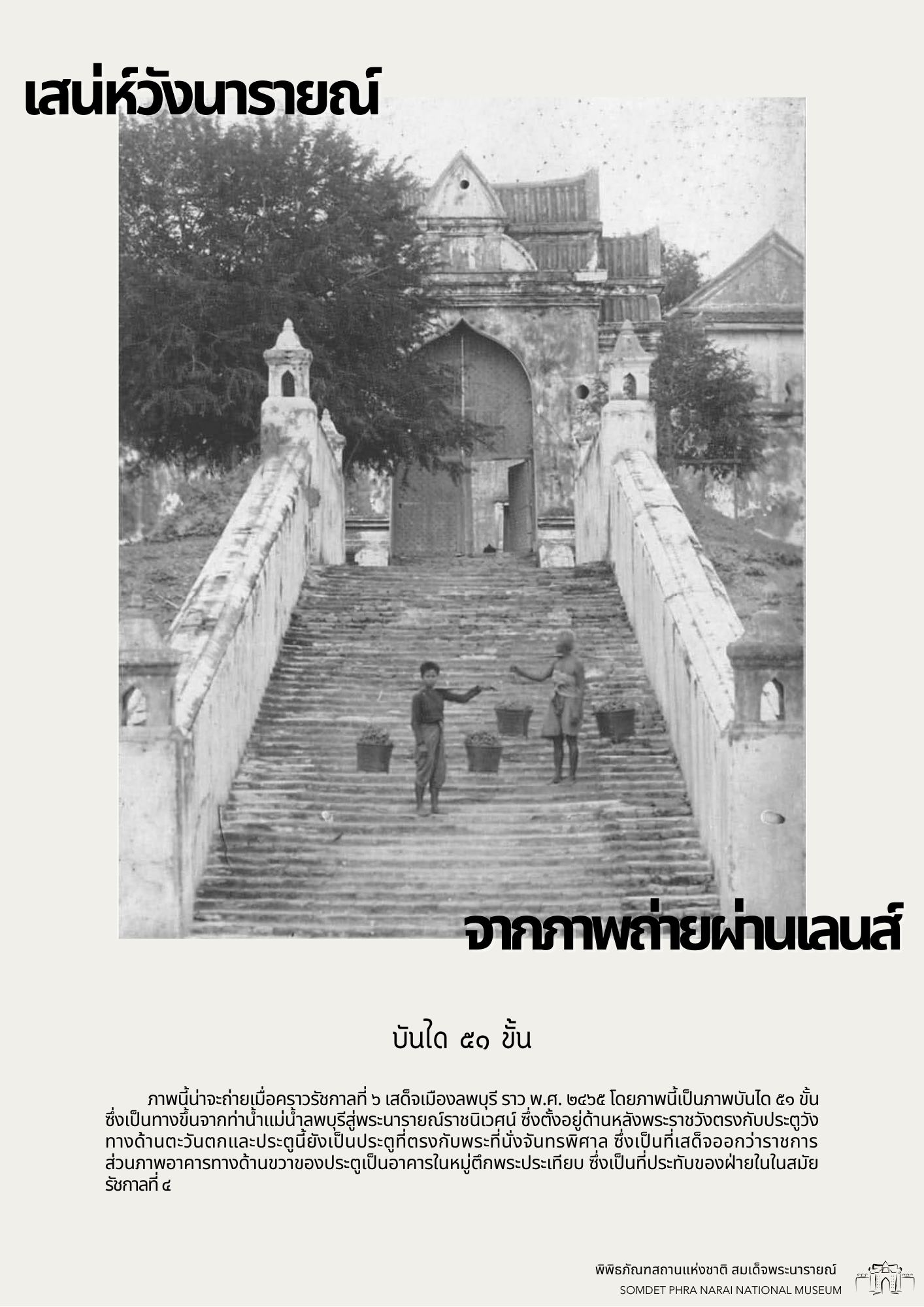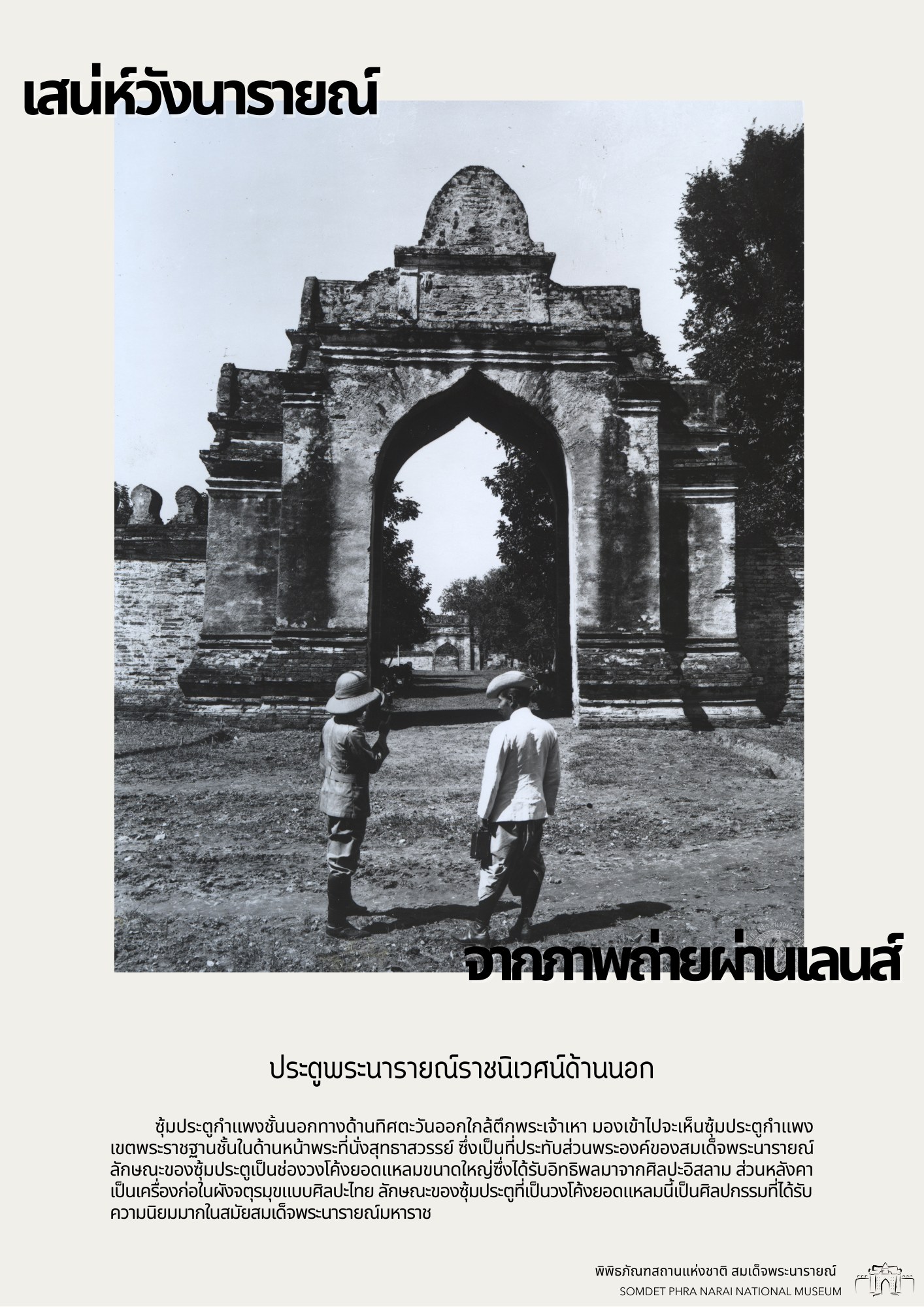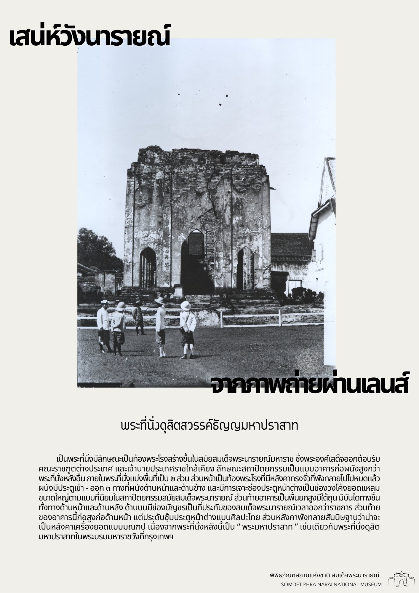 วันนี้ทางพิพิธภัณฑสถานแห่งชาติ สมเด็จพระนารายณ์ ได้รวบรวมภาพถ่ายเก่าภายในบริเวณนารายณ์ราชนิเวศน์ ซึ่งเป็นชุดภาพถ่ายเก่าที่บอกเล่าเหตุการณ์และสถานที่ในอดีตได้อย่างชัดเจน นอกจากนี้ ภาพถ่ายเก่ายังมีเนื้อหาที่แสดงให้เห็นถึงการเปลื่ยนแปลงต่าง ๆ จึงขอเชิญชวนทุกท่านมาย้อนอดีตไปกับชุดภาพถ่ายเก่าใน "เสน่ห์วังนารายณ์ จากภาพถ่ายผ่านเลนส์" เพื่อกลับไปดูบรรยากาศของวังนารายณ์ในสมัยอดีต ซึ่งจะได้เห็นสภาพพระนารายณ์ราชนิเวศน์ ขนบธรรมเนียมประเพณี วัฒนธรรมการแต่งกาย รวมไปถึงวิถีชีวิตความเป็นอยู่ที่หลากหลายมุมมองของผู้คนในยุคนั้น