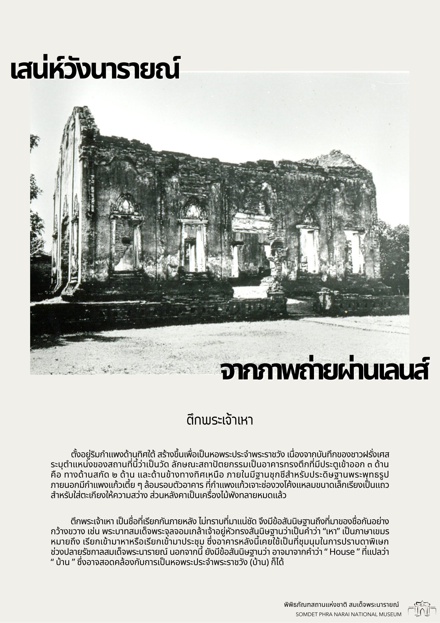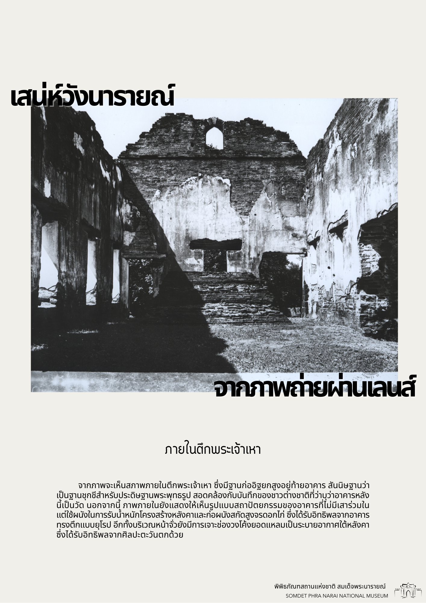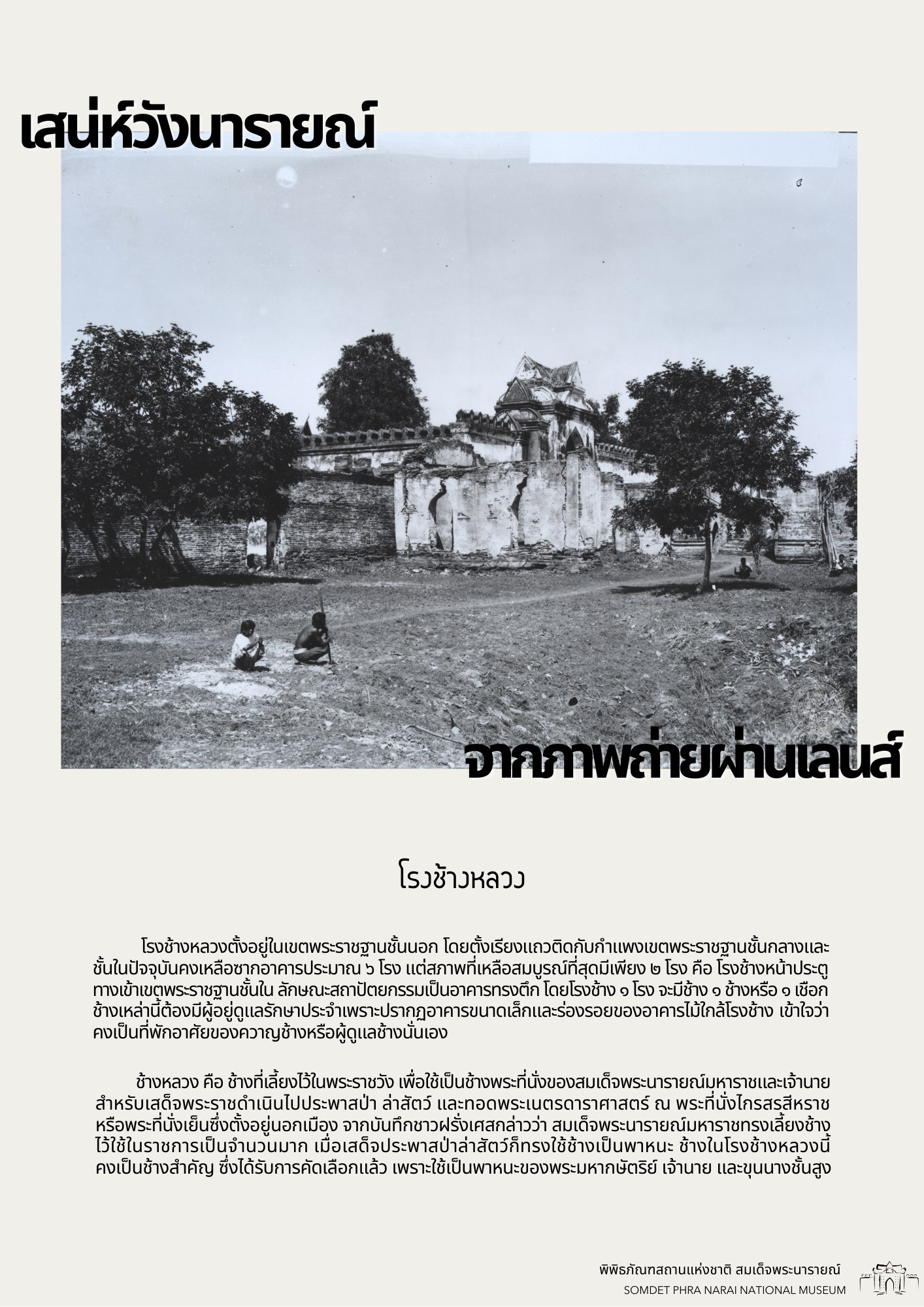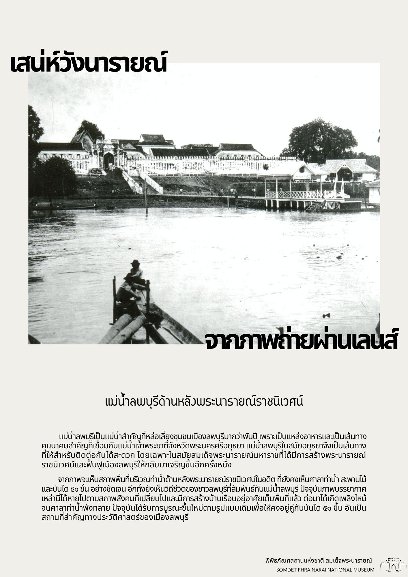 วันนี้ทางพิพิธภัณฑสถานแห่งชาติ สมเด็จพระนารายณ์ ได้รวบรวมภาพถ่ายเก่าภายในบริเวณนารายณ์ราชนิเวศน์ ซึ่งเป็นชุดภาพถ่ายเก่าที่บอกเล่าเหตุการณ์และสถานที่ในอดีตได้อย่างชัดเจน นอกจากนี้ ภาพถ่ายเก่ายังมีเนื้อหาที่แสดงให้เห็นถึงการเปลื่ยนแปลงต่าง ๆ จึงขอเชิญชวนทุกท่านมาย้อนอดีตไปกับชุดภาพถ่ายเก่าใน "เสน่ห์วังนารายณ์ จากภาพถ่ายผ่านเลนส์" เพื่อกลับไปดูบรรยากาศของวังนารายณ์ในสมัยอดีต ซึ่งจะได้เห็นสภาพพระนารายณ์ราชนิเวศน์ ขนบธรรมเนียมประเพณี วัฒนธรรมการแต่งกาย รวมไปถึงวิถีชีวิตความเป็นอยู่ที่หลากหลายมุมมองของผู้คนในยุคนั้น