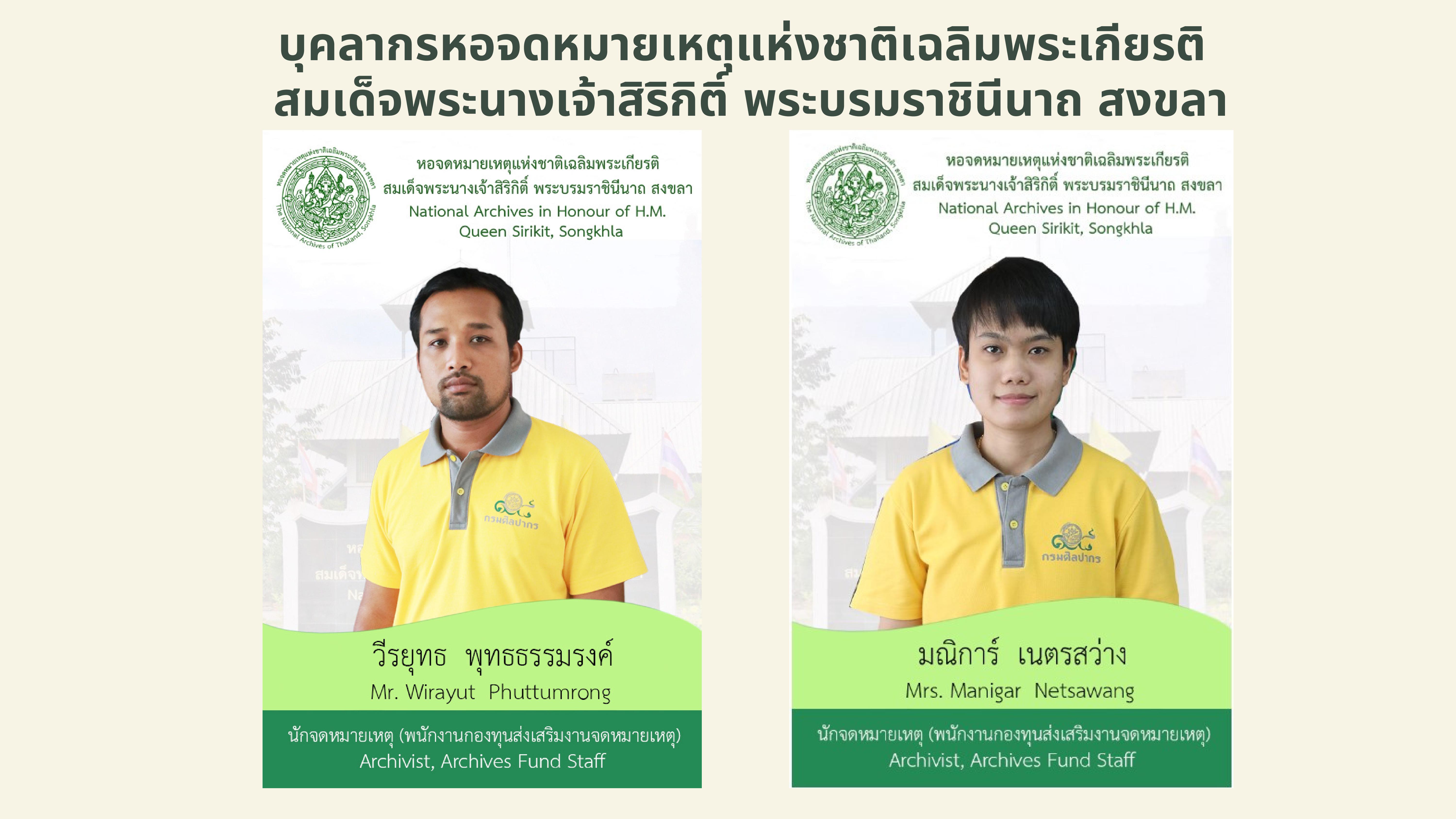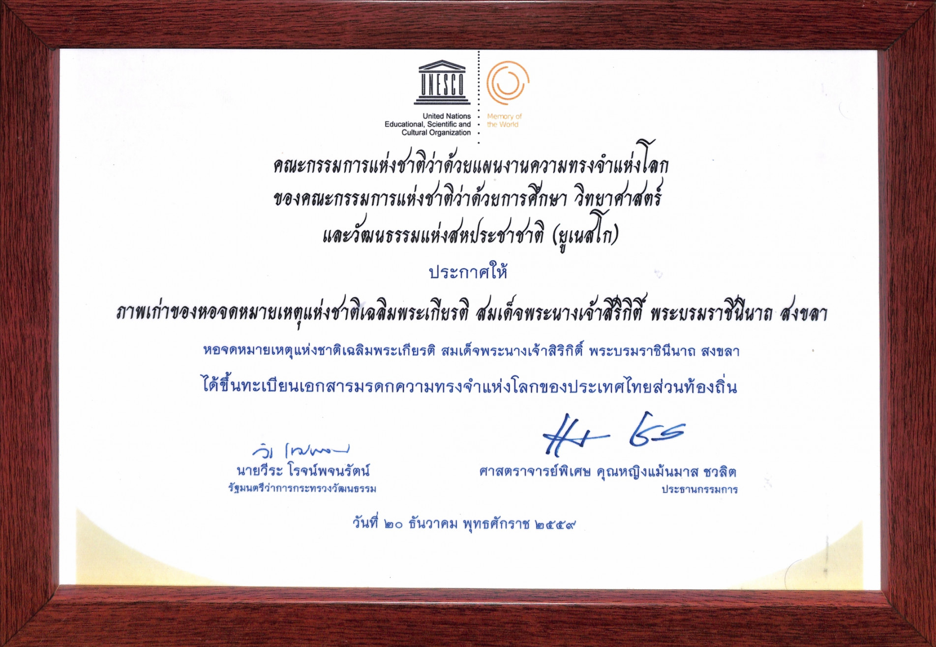 พุทธศักราช ๒๕๕๗ : ผู้อนุรักษ์มรดกไทยดีเด่น และผู้สนับสนุนมรดกศิลปวัฒนธรรมของชาติ ๒๕๕๖ (เสนอรายชื่อโดยหอจดหมายเหตุแห่งชาติเฉลิมพระเกียรติฯ สงขลา) เข้ารับพระราชทานเข็มเกียรติคุณวันอนุรักษ์มรดกไทย วันศุกร์ที่ ๓ มกราคม ๒๕๕๗ ณ พระที่นั่งอิศราวินิจฉัย พิพิธภัณฑสถานแห่งชาติ พระนคร