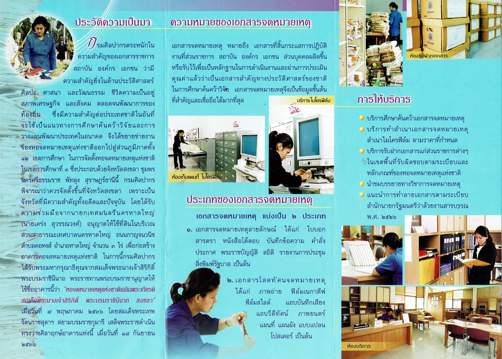 รวมพัฒนาการของแผ่นพับเเนะนำหอจดหมายเหตุแห่งชาติเฉลิมพระเกียรติฯ สงขลา ตั้งแต่อดีต จนถึงปัจจุบัน