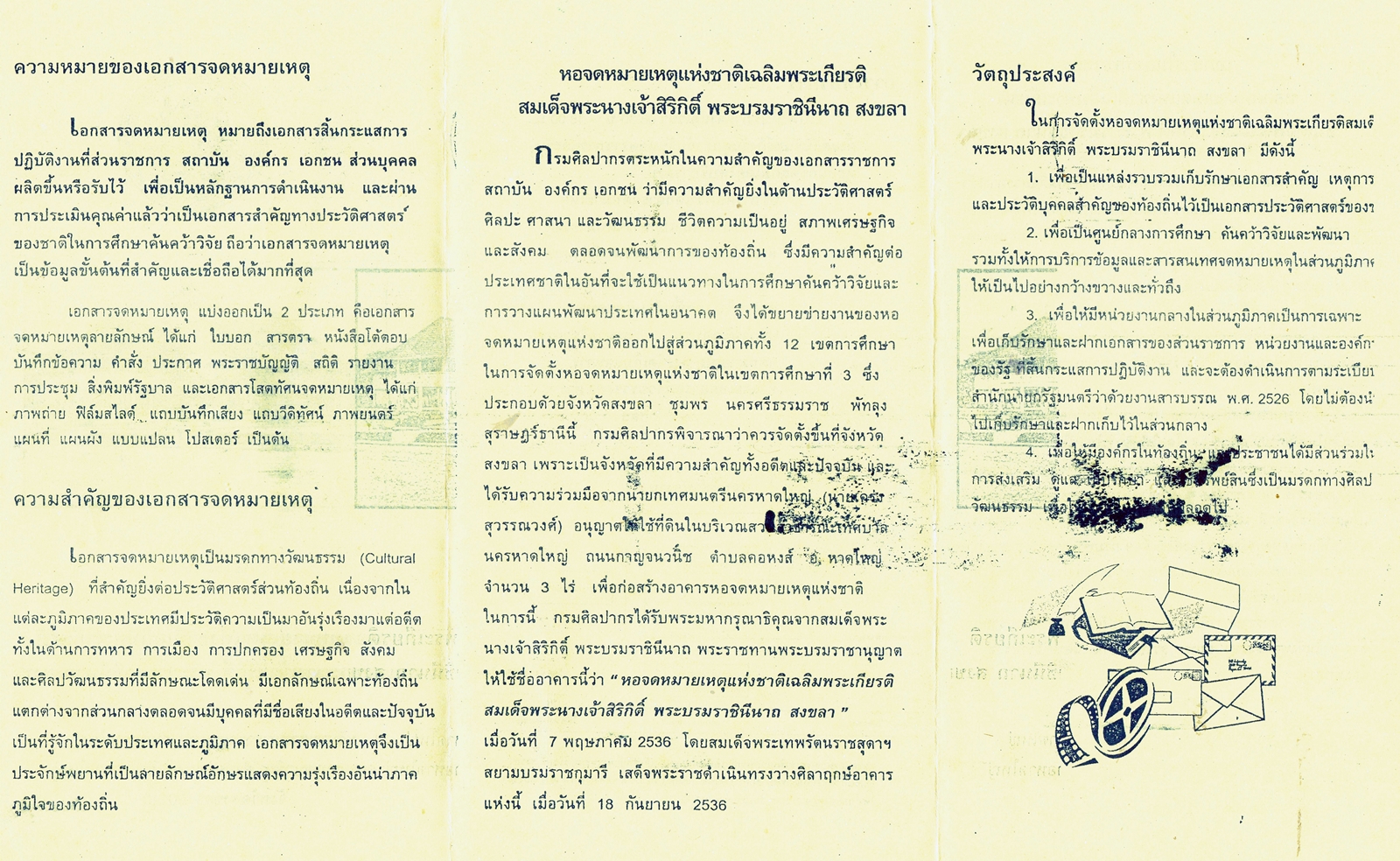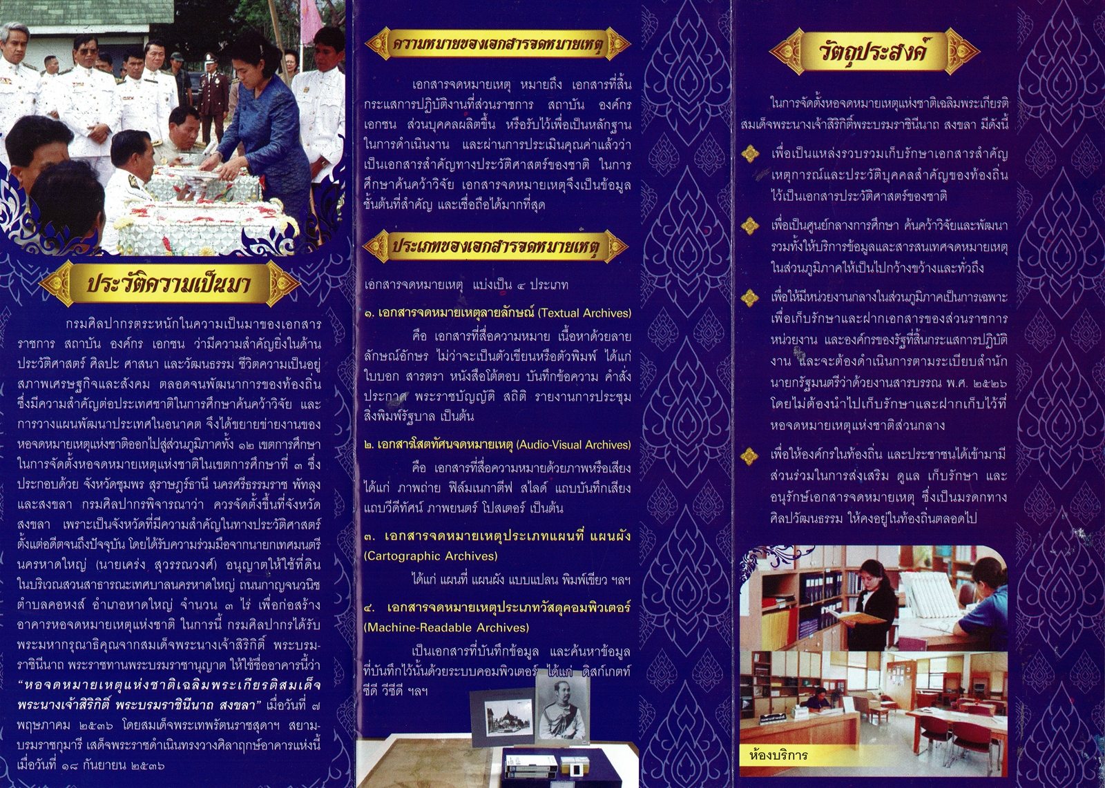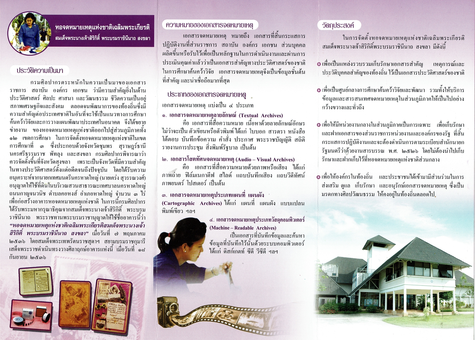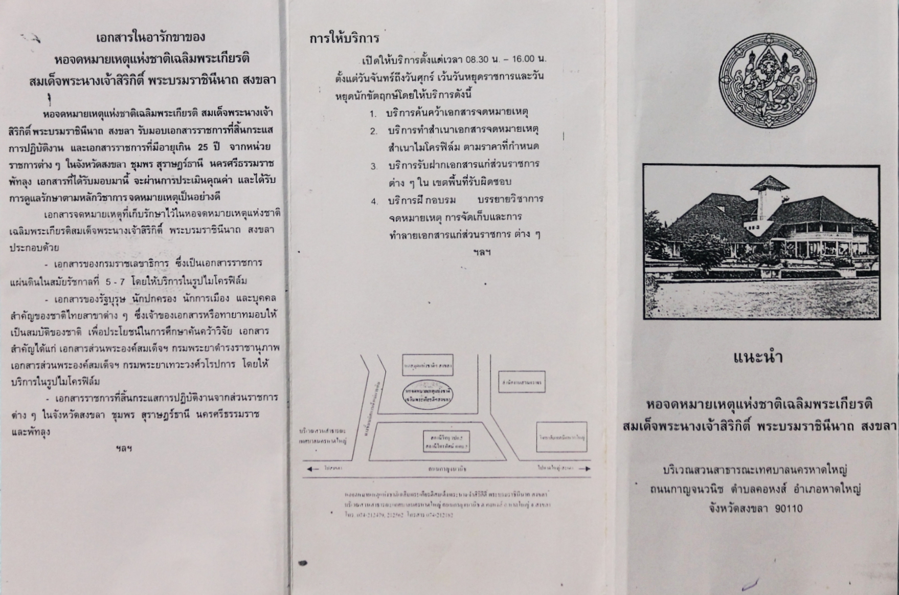 พัฒนาการแผ่นพับเเนะนำหอจดหมายเหตุแห่งชาติเฉลิมพระเกียรติฯ สงขลา