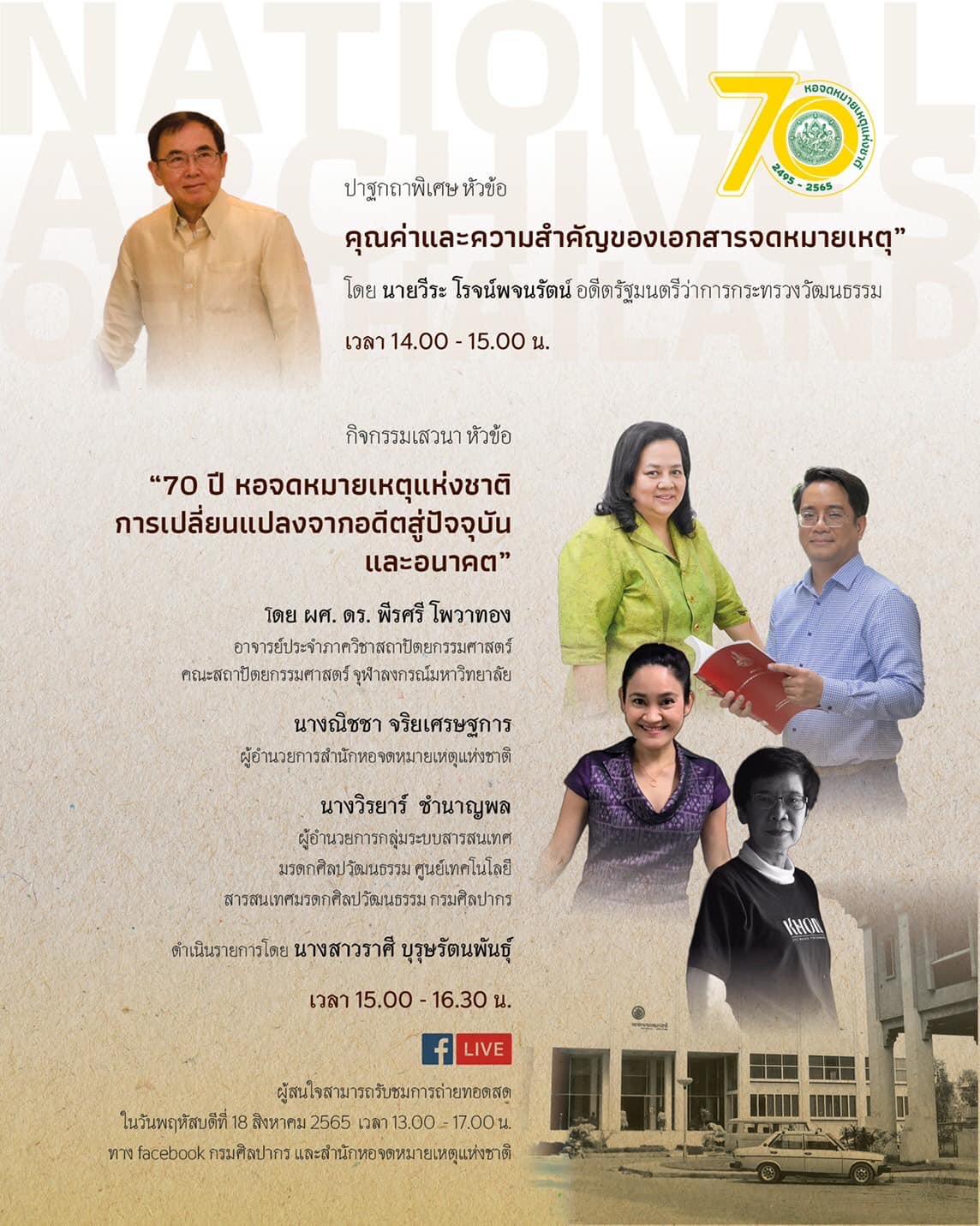 สำนักหอจดหมายเหตุแห่งชาติ กรมศิลปากร ขอเชิญร่วมรับชมกิจกรรมในโอกาสที่สำนักหอจดหมายเหตุแห่งชาติมีอายุครบ 70 ปี เพื่อเฉลิมฉลองการพัฒนาการดำเนินงานของหอจดหมายเหตุแห่งชาติในฐานะองค์กรทางวิชาชีพงานจดหมายเหตุในประเทศ และประชาสัมพันธ์หอจดหมายเหตุแห่งชาติให้เป็นที่รู้จักในวงกว้าง ภายในงานมีกิจกรรมที่น่าสนใจ ดังนี้