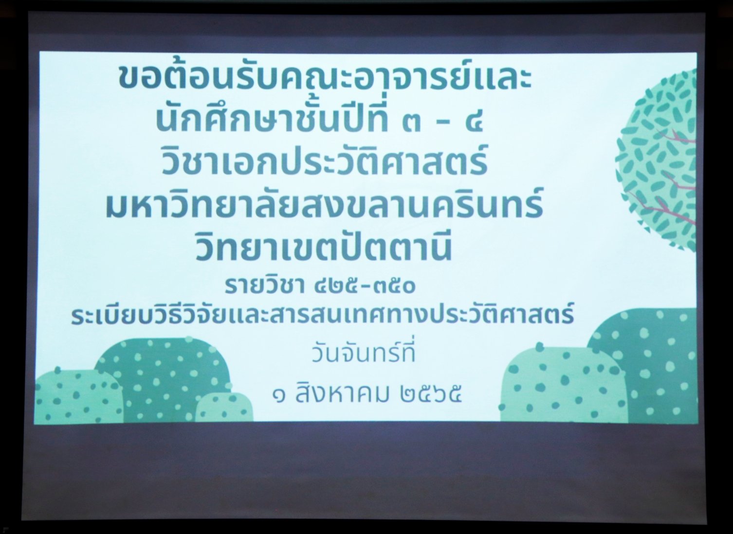 บรรยายให้ความรู้ในโครงการอบรมเชิงปฏิบัติการการค้นคว้าเอกสารจดหมายเหตุ เพื่อการวิจัยทางประวัติศาสตร์ รายวิชา ๔๒๕-๓๕๐ ระเบียบวิธีวิจัยเเละสารสนเทศทางประวัติศาสตร์ และรายวิชา ๔๒๕-๔๕๑ การวิจัยทางประวัติศาสตร์ แก่นักศึกษาหลักสูตรศิลปศาสตร์บัณฑิต สาขาวิชาประวัติศาสตร์ คณะมนุษย์ศาสตร์และสังคมศาสตร์ มหาวิทยาลัยสงขลานครินทร์ วิทยาเขตปัตตานี