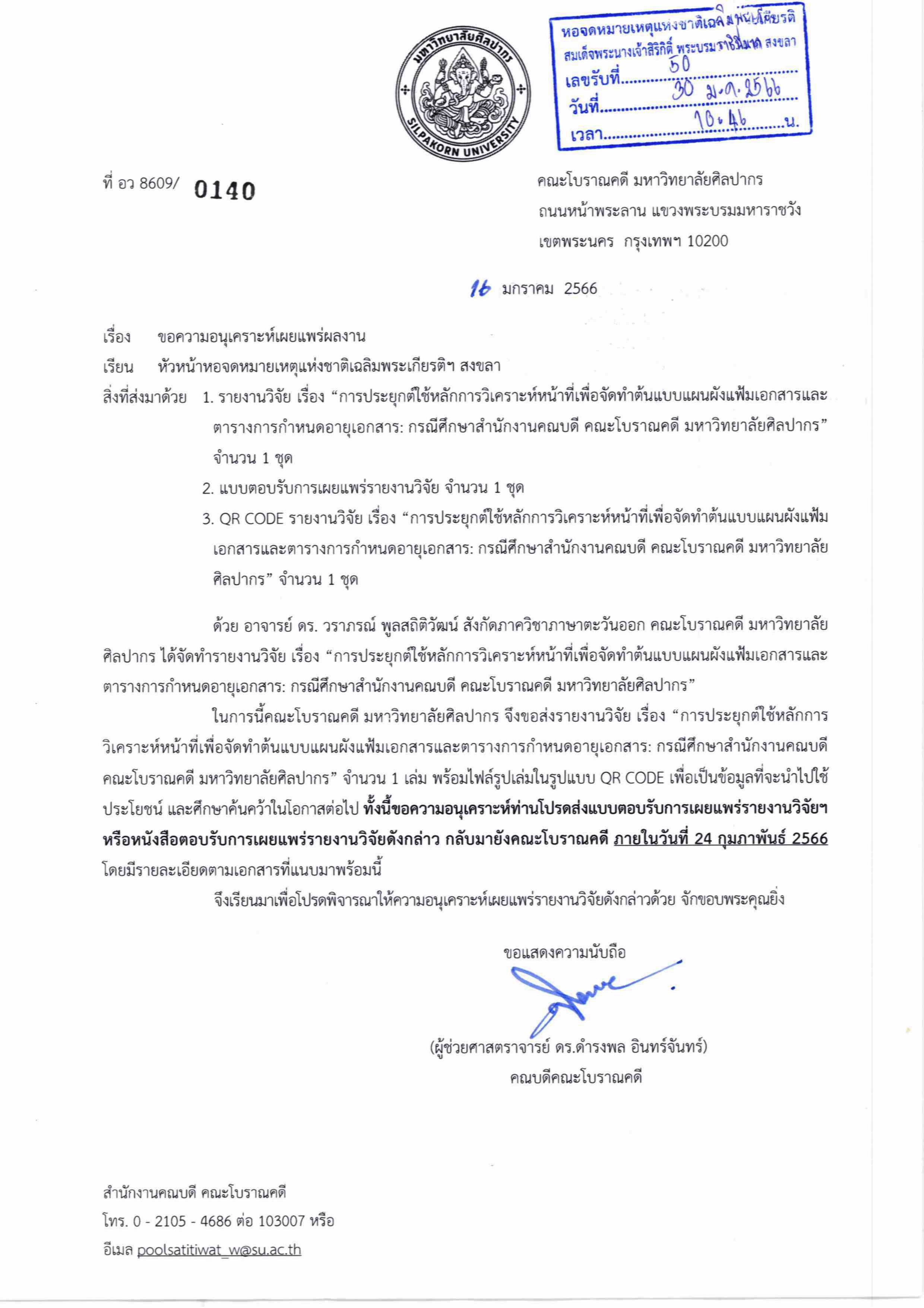 งานวิจัยฉบับสมบูรณ์ เรื่อง การประยุกต์ใช้หลักการวิเคราะห์หน้าที่เพื่อจัดทำต้นแบบ แผนผังแฟ้มเอกสารและตารางการกำหนดอายุเอกสาร : กรณีศึกษาสำนักงานคณบดี คณะโบราณคดี มหาวิทยาลัยศิลปากร
