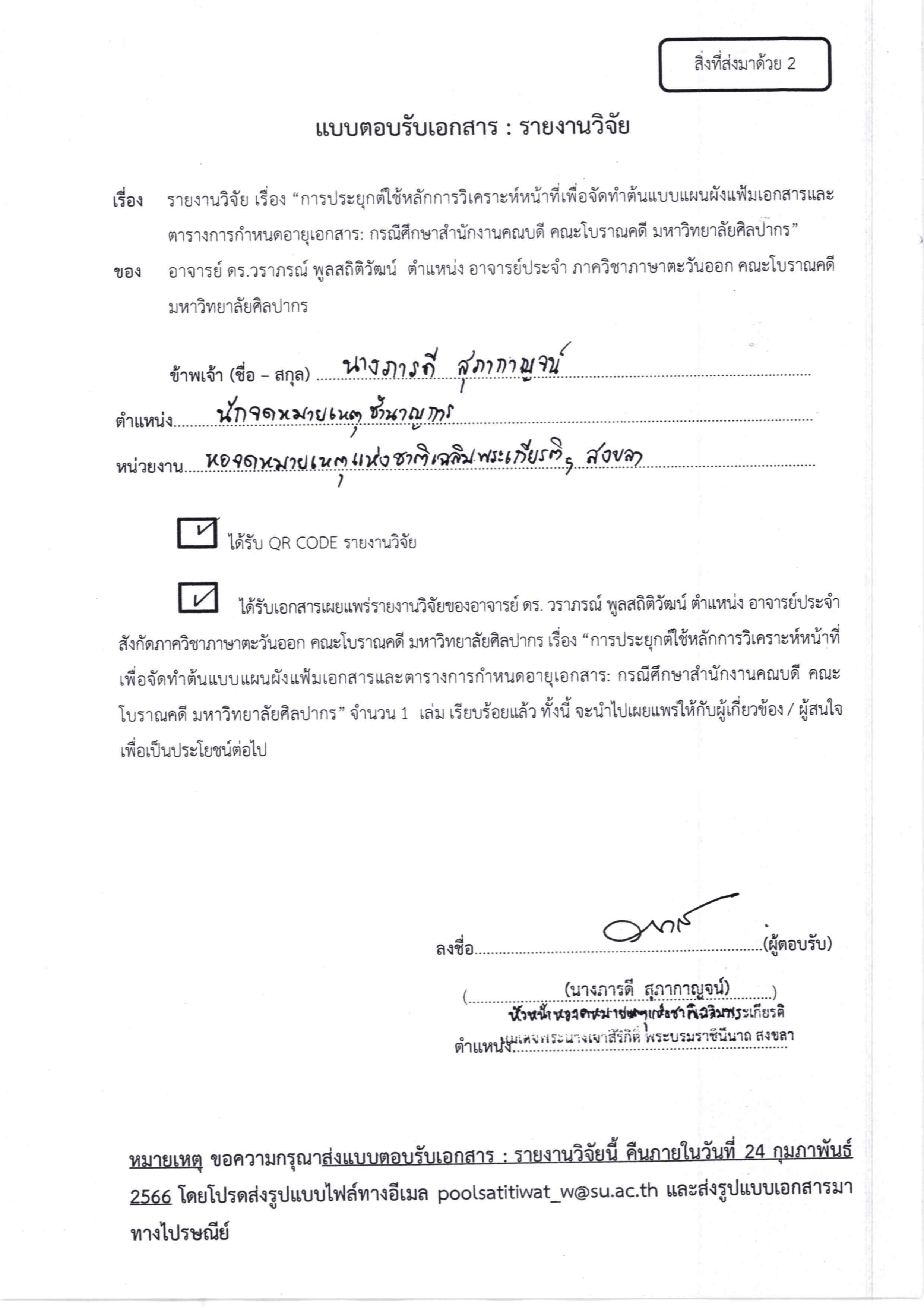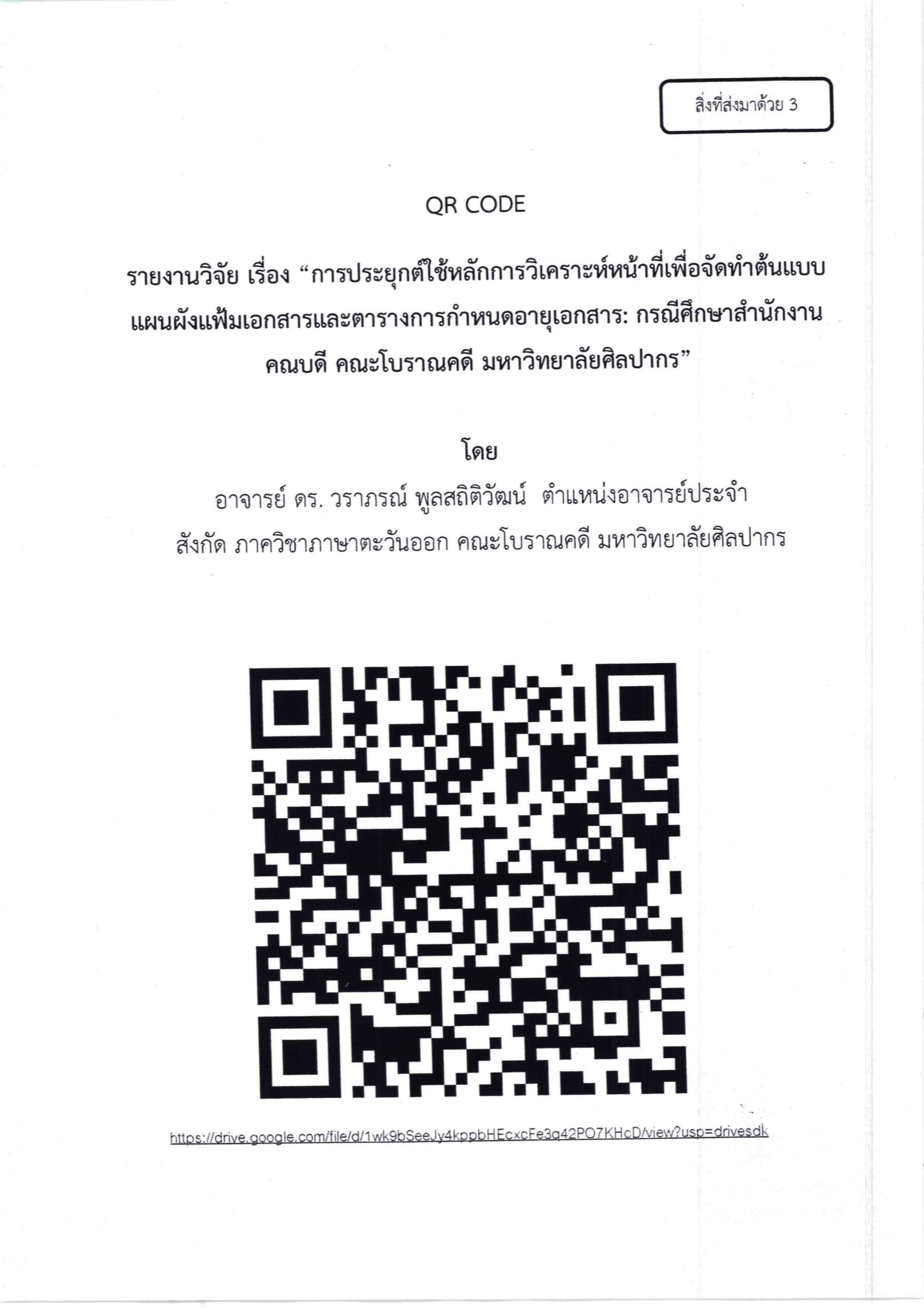 - งานวิจัยฉบับสมบูรณ์ เรื่อง การประยุกต์ใช้หลักการวิเคราะห์หน้าที่เพื่อจัดทำต้นแบบ แผนผังแฟ้มเอกสารและตารางการกำหนดอายุเอกสาร : กรณีศึกษาสำนักงานคณบดี คณะโบราณคดี มหาวิทยาลัยศิลปากร