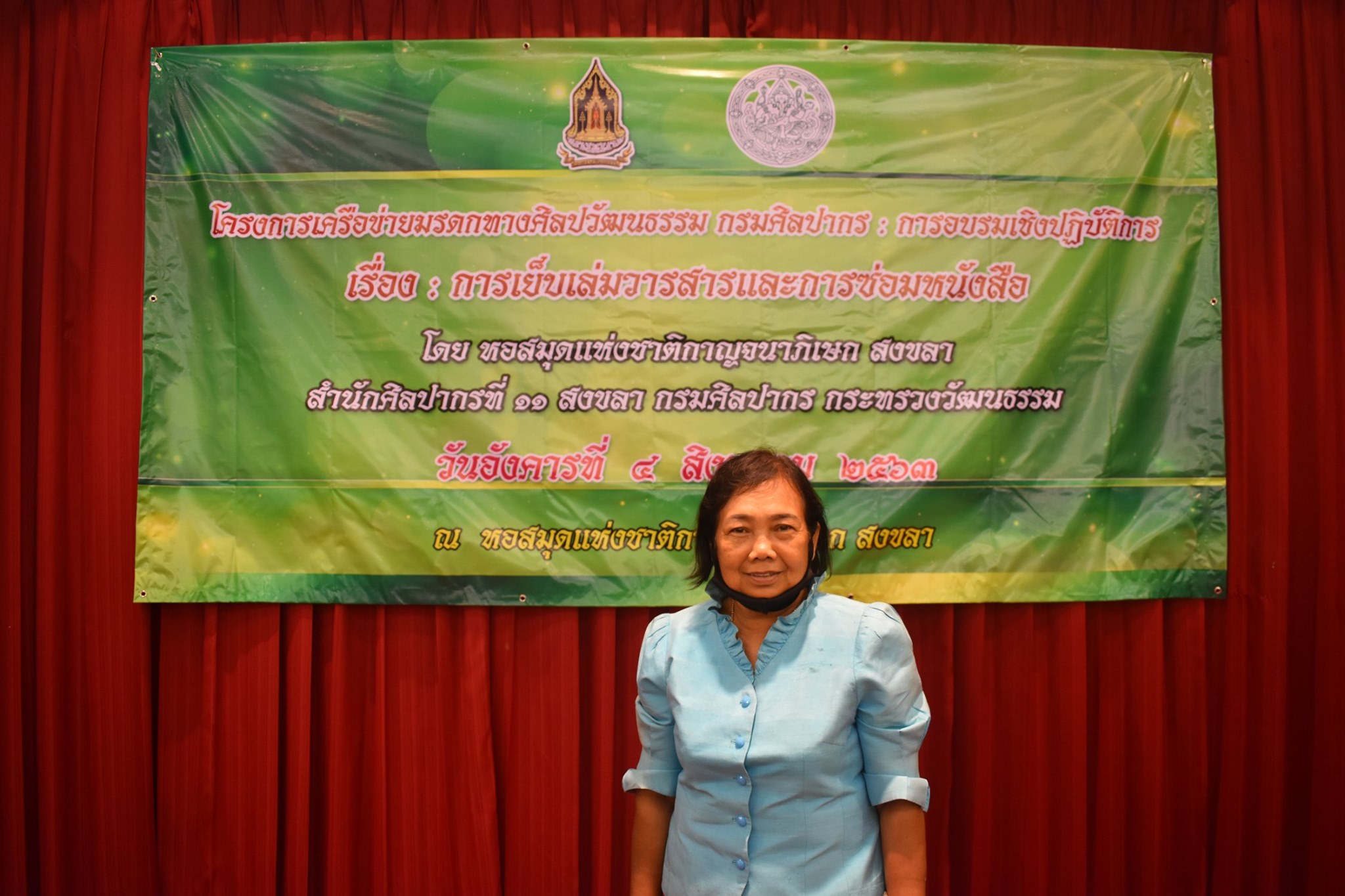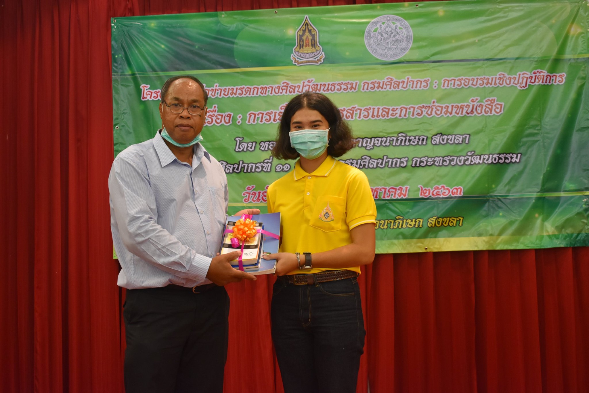 โครงการเครือข่ายมรดกทางศิลปวัฒนธรรมกรมศิลปากร การอบรมเชิงปฏิบัติการเรื่อง " การเย็บเล่มวารสารและการซ่อมหนังสือ " ณ ห้องประชุม หอสมุดแห่งชาติกาญจนาภิเษก สงขลา วันอังคารที่ ๔ กรกฎาคม พ.ศ. ๒๕๖๓