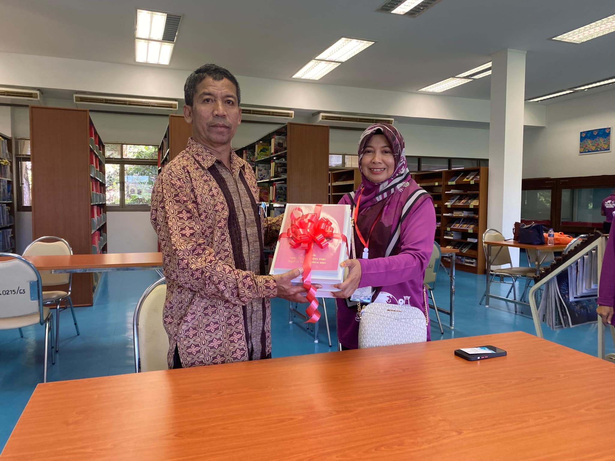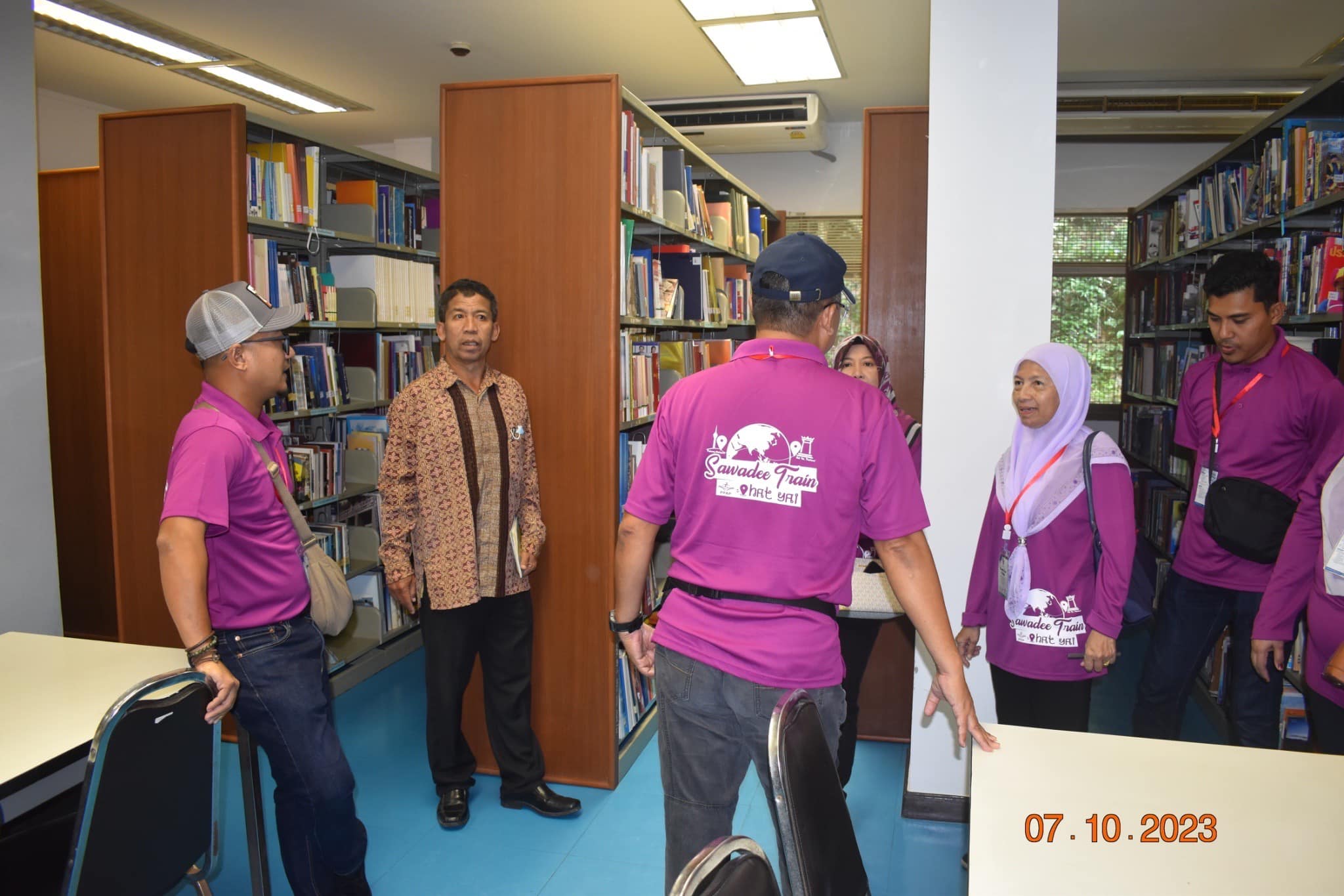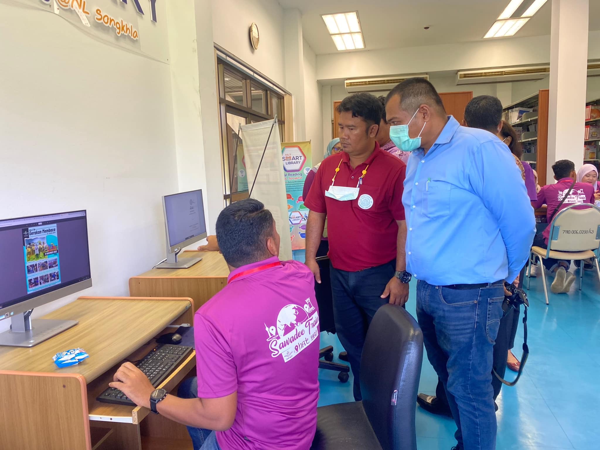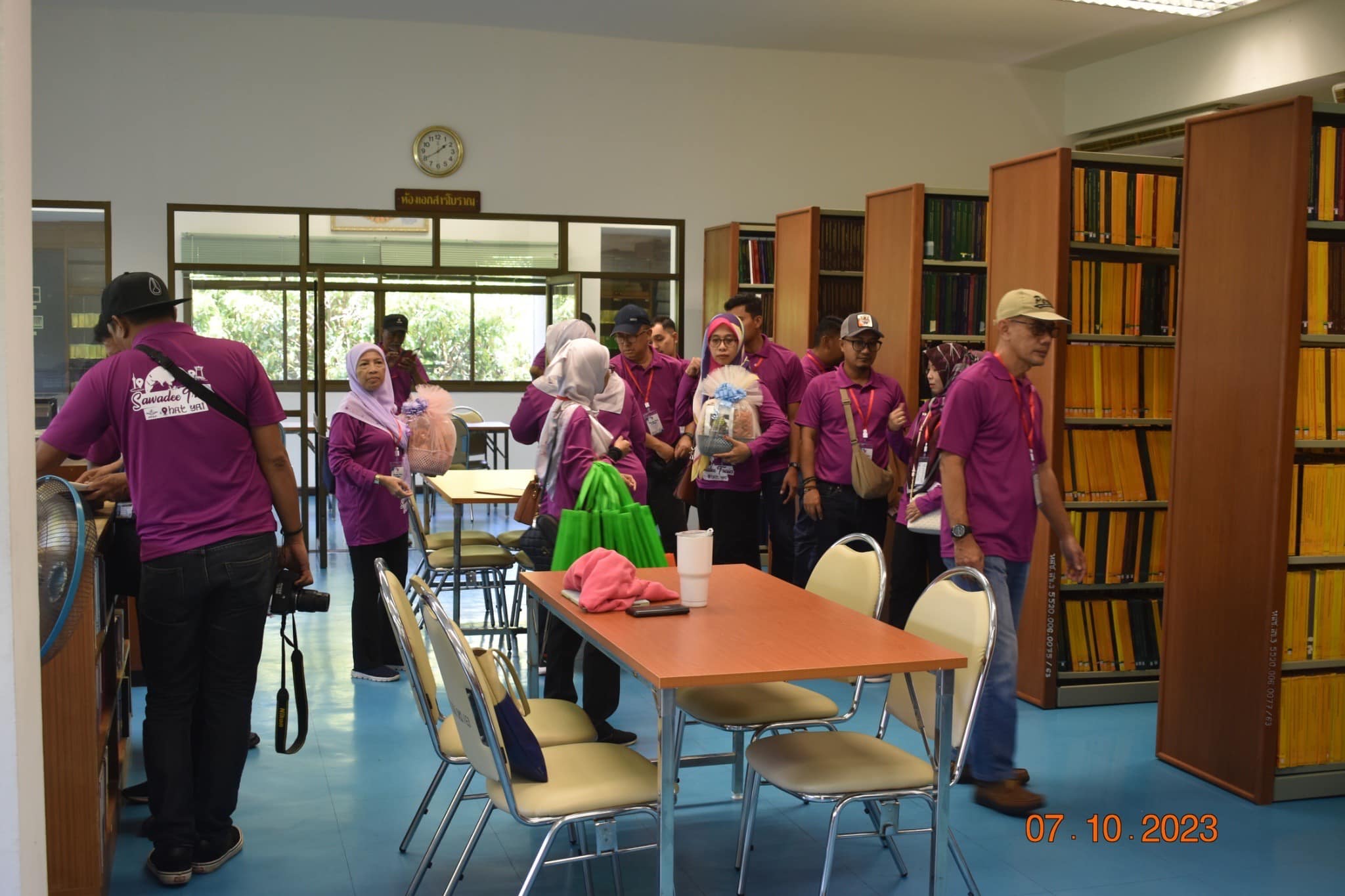 นายสุรพันธ์ สุวรรณโณ บรรณารักษ์ชำนาญการ รักษาการในตำแหน่งหัวหน้าหอสมุดแห่งชาติกาญจนาภิเษก สงขลา พร้อมบุคลลากร ให้การต้อนรับและนำชมแก่คณะผู้บริหารและบรรณารักษ์ จำนวน ๓๒ คน จาก Pahang State Library , Malaysia
