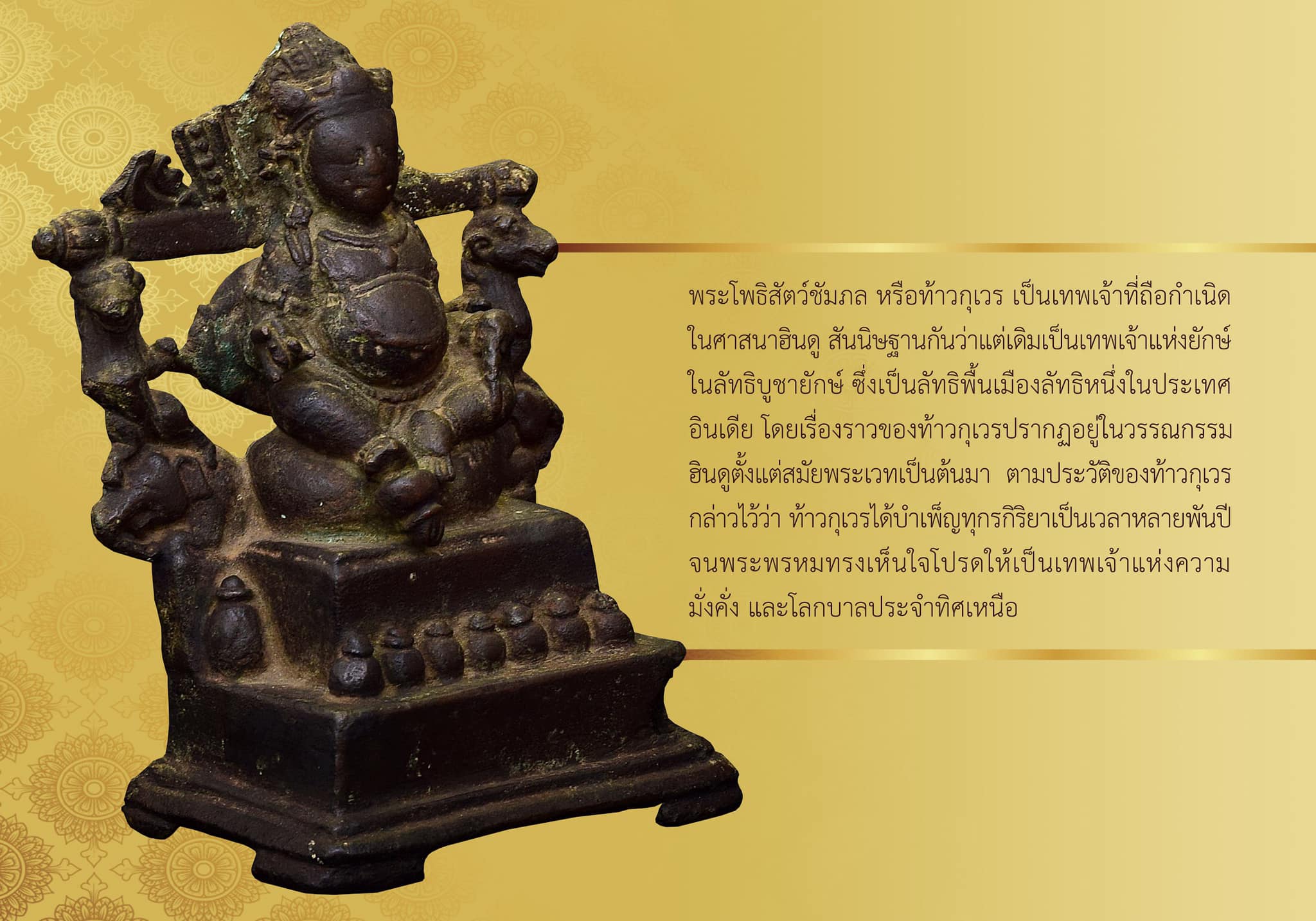 พระโพธิสัตว์ชัมภล หรือท้าวกุเวร เป็นเทพเจ้าที่ถือกำเนิดในศาสนาฮินดู สันนิษฐานกันว่าแต่เดิมเป็นเทพเจ้าแห่งยักษ์ในลัทธิบูชายักษ์ ซึ่งเป็นลัทธิพื้นเมืองลัทธิหนึ่งในประเทศอินเดีย โดยเรื่องราวของท้าวกุเวรปรากฏอยู่ในวรรณกรรมฮินดูตั้งแต่สมัยพระเวทเป็นต้นมา ตามประวัติของท้าวกุเวรกล่าวไว้ว่า ท้าวกุเวรได้บำเพ็ญทุกรกิริยาเป็นเวลาหลายพันปีจนพระพรหมทรงเห็นใจโปรดให้เป็นเทพเจ้าแห่งความมั่งคั่ง และโลกบาลประจำทิศเหนือ