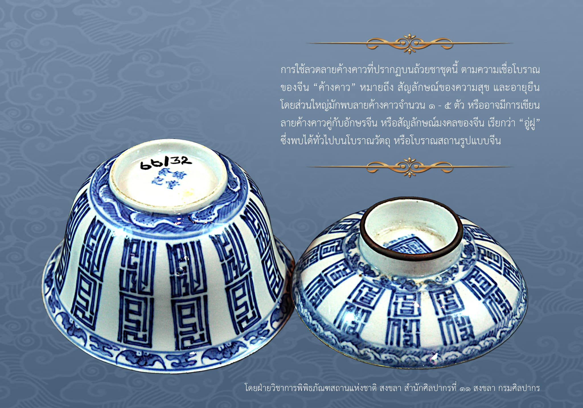 การใช้ลวดลายค้างคาวที่ปรากฏบนถ้วยชาชุดนี้ ตามความเชื่อโบราณของจีน “ค้างคาว” หมายถึง สัญลักษณ์ของความสุข และอายุยืน โดยส่วนใหญ่มักพบลายค้างคาวจำนวน 1-5ตัว หรืออาจมีการเขียนลายค้างคาวคู่กับอักษรจีน หรือสัญลักษณ์มงคลของจีน เรียกว่า “อู่ฝู” ซึ่งพบได้ทั่วไปบนโบราณวัตถุ หรือโบราณสถานรูปแบบจีน