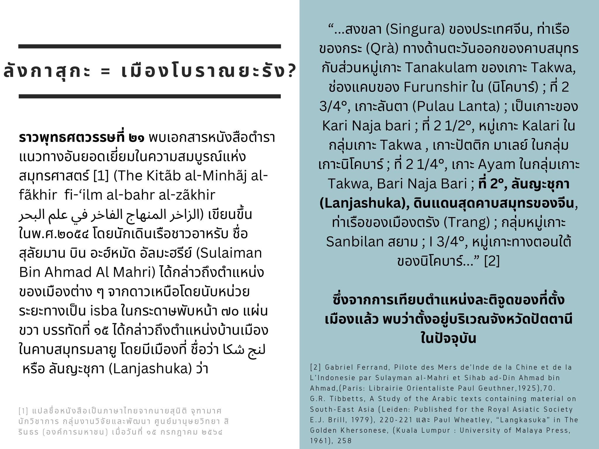 นำเสนอเกี่ยวกับชื่อ “ลังกาสุกะ” ที่ปรากฏในเอกสารโบราณต่างๆ และสันนิษฐานว่ามีศูนย์กลางอยู่ที่เมืองโบราณยะรัง