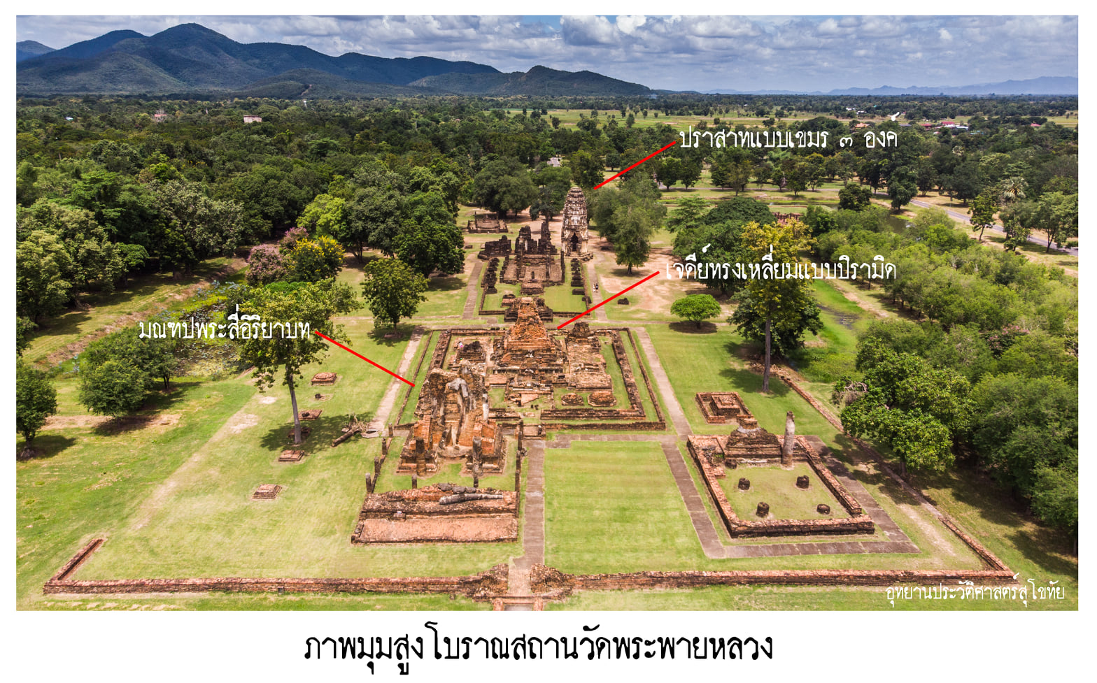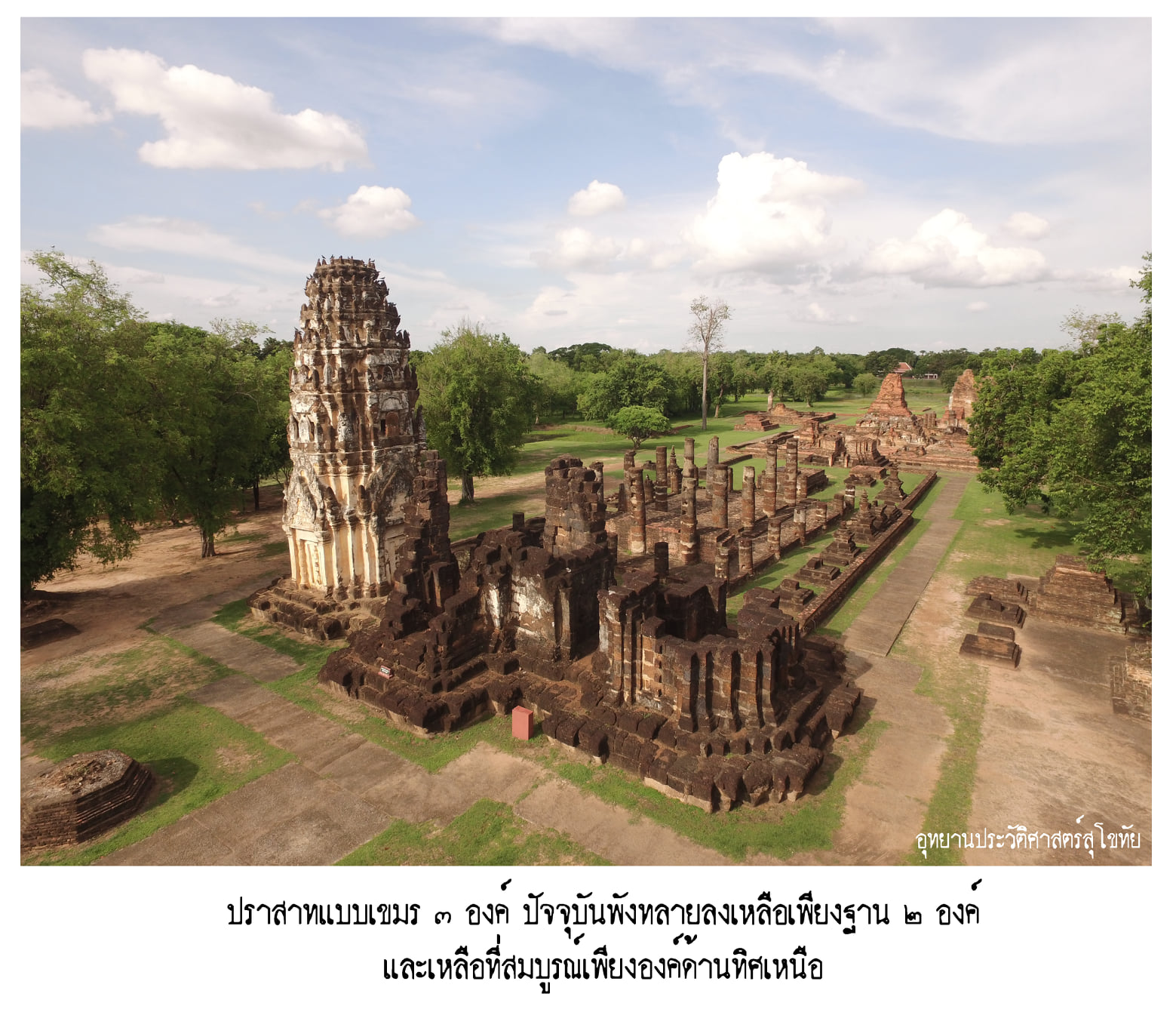 กลุ่มโบราณสถานตั้งอยู่ตรงกลางในพื้นที่ที่มีคูน้ำล้อมรอบ คูน้ำแต่ละด้านมีความยาวประมาณ ๖๐๐ เมตร โบราณสถานที่เก่าแก่ที่สุดเป็นปราสาทแบบเขมร ๓ องค์ ปัจจุบันพังทลายลงเหลือเพียงฐาน ๒ องค์ และที่สมบูรณ์เพียงองค์ด้านทิศเหนือ มีลวดลายปูนปั้นประดับเล่าเรื่องตามพุทธประวัติเหมือนกับปราสาทที่วัดพระศรีรัตนมหาธาตุ ลพบุรี และปราสาทปาลิไลย์ ในเมืองพระนครหลวงของเขมร เป็นเครื่องยืนยันว่า ในราวกลางพุทธศตวรรษที่ ๑๘ ชุมชนสุโขทัยมีวัฒนธรรมร่วมกับเขมรในสมัยพระเจ้าชัยวรมันที่ ๗ และมีความเกี่ยวข้องกับเมืองละโว้ (ลพบุรี) เมืองใหญ่ที่เป็นตัวแทนของวัฒนธรรมเขมร ในที่ราบลุ่มแม่น้ำภาคกลางของประเทศไทย