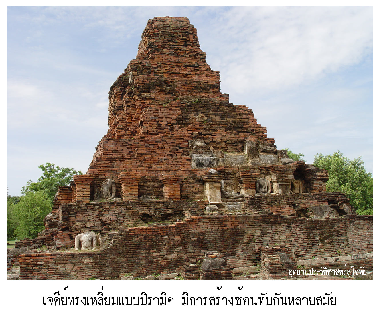 ถัดจากปราสาทไปทางตะวันออก มีวิหาร มีเจดีย์ทรงเหลี่ยมแบบปิรามิดประดับทุกด้านด้วยซุ้มพระพุทธรูปลดหลั่นเป็นชั้น ๆ ขึ้นไป เหมือนกับเจดีย์กู่กุด จังหวัดลำพูน ที่เจดีย์นี้มีหลักฐานการก่อสร้างทับซ้อนกันหลายสมัย เช่น มีพระพุทธรูปในซุ้มเป็นแบบหมวดวัดตระกวนอยู่ภายใน โดยถูกปิดและซ้อนทับอยู่ด้วยพระพุทธรูปสุโขทัยหมวดใหญ่อันเป็นที่รู้จักกันทั่วไป เป็นต้น