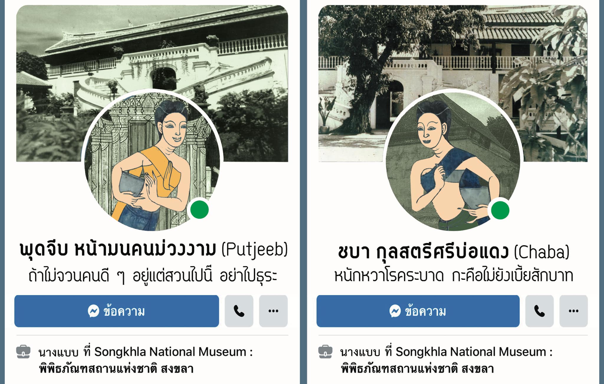 เชื่อว่าหลายท่านเคยผ่านตาภาพหญิงสาว 4 คน ที่ทางพิพิธภัณฑสถานแห่งชาติ สงขลา ได้นำมาใช้ในการออกแบบป้ายประชาสัมพันธ์หรือข้อมูลต่าง ๆ และอาจมีความสงสัยว่า แม่จ๊ะแม่จ๋า ทั้ง 4 นาง มาจากไหน มีความเป็นมาอย่างไร วันนี้จึงขอนำเสนอองค์ความรู้พิเศษเพื่อเปิดเผยที่มาของสาวงามทั้ง 4