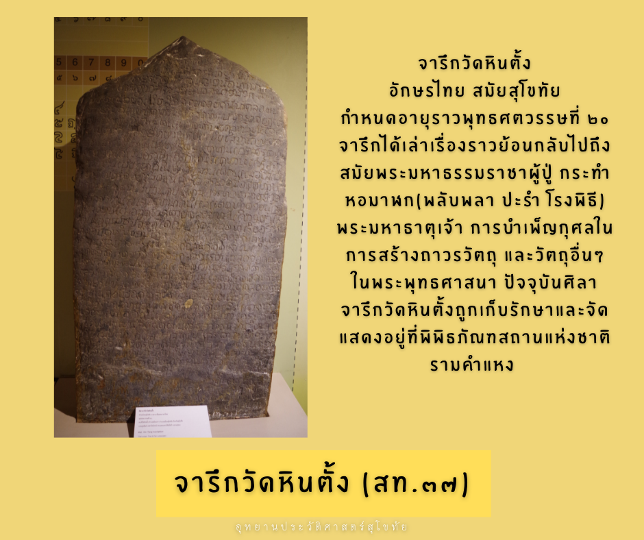 นอกจากนี้วัดหินตั้งยังได้พบศิลาจารึกวัดหินตั้ง (สท.๓๗) อักษรไทยสุโขทัย ภาษาไทย กำหนดอายุราวพุทธศตวรรษที่ ๒๐ จารึกได้เล่าเรื่องราวย้อนกลับไปถึงสมัยพระมหาธรรมราชาผู้ปู่ กระทำหอมาฬก(พลับพลา ปะรำ โรงพิธี) พระมหาธาตุเจ้า การบำเพ็ญกุศลในการสร้างถาวรวัตถุ และวัตถุอื่นๆ ในพระพุทธศาสนา ปัจจุบันศิลาจารึกวัดหินตั้งถูกเก็บรักษาและจัดแสดงอยู่ที่พิพิธภัณฑสถานแห่งชาติ รามคำแหง
