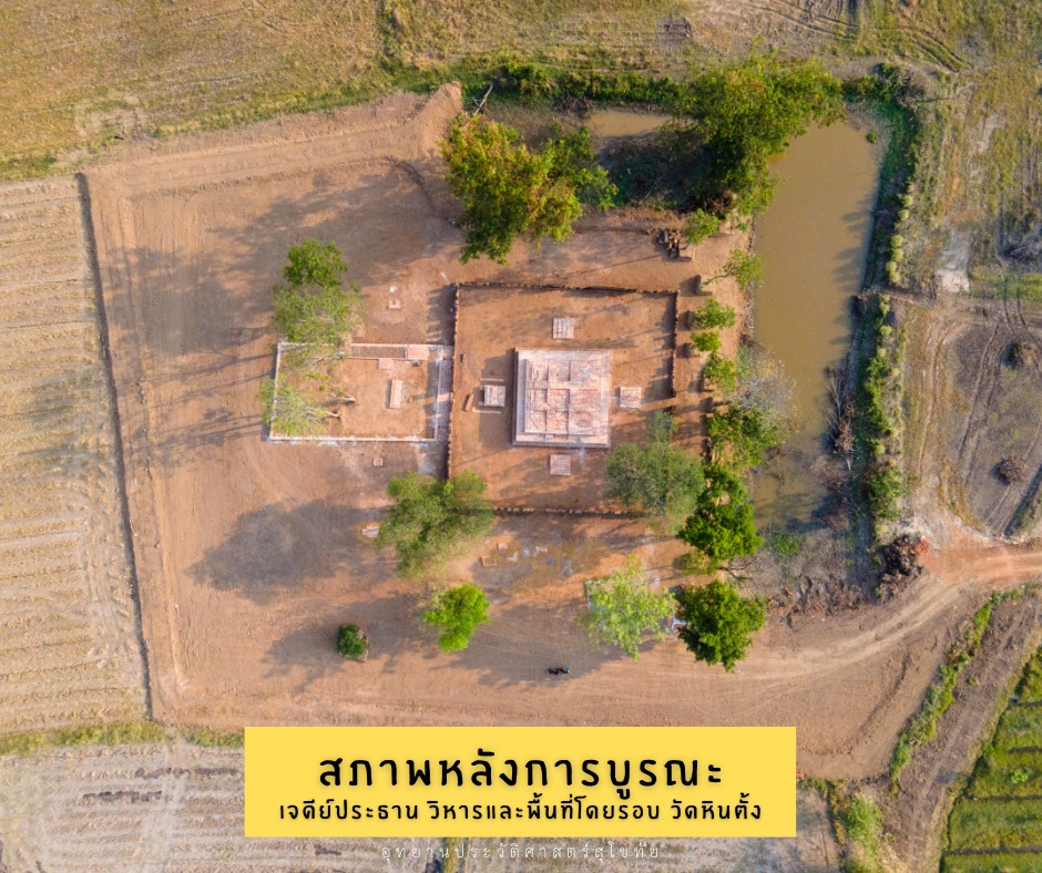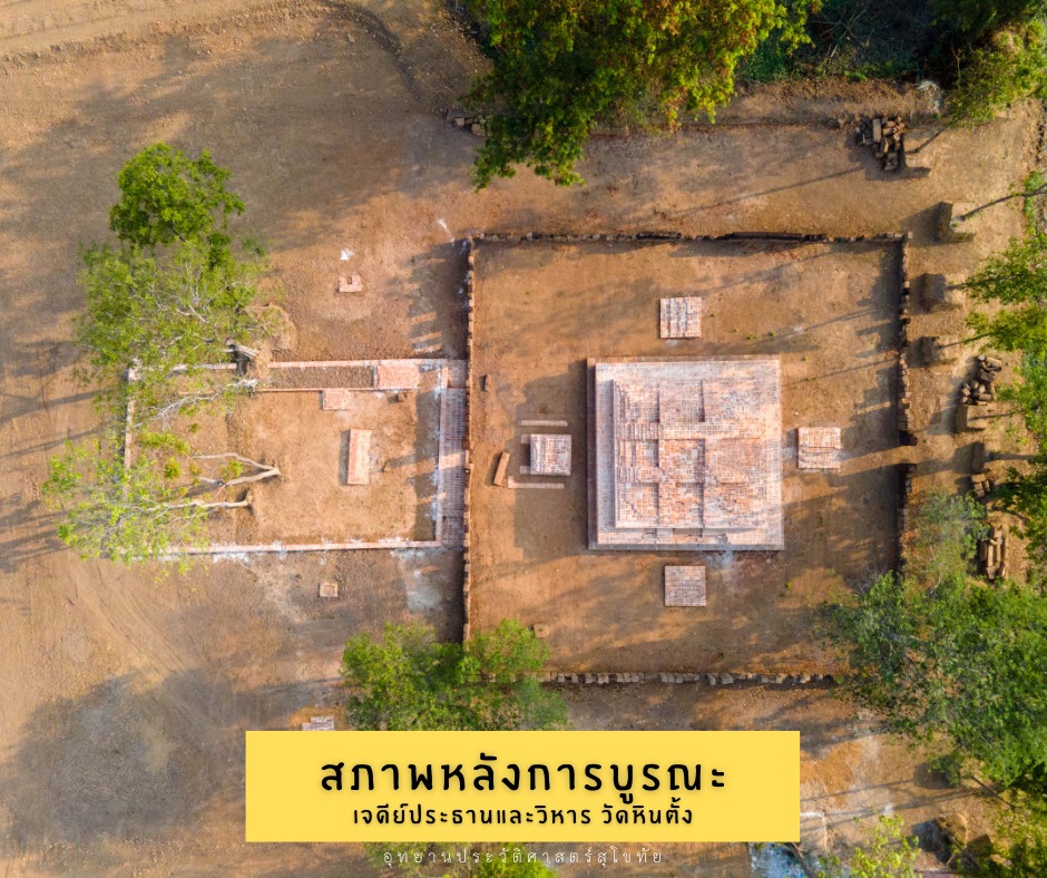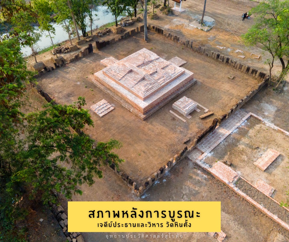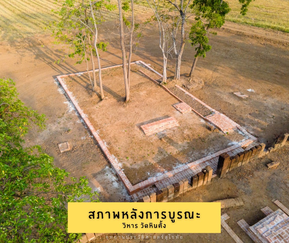 และปี พ.ศ.๒๕๖๔ ได้ดำเนินโครงการปรับภูมิทัศน์และบูรณะโบราณสถานวัดหินตั้ง เพื่อพัฒนาแหล่งโบราณคดีแห่งนี้เป็นแหล่งเรียนรู้และแหล่งท่องเที่ยวของอุทยานประวัติศาสตร์สุโขทัย นอกจากนี้ยังทำการขุดค้นขุดแต่งและขุดตรวจทางโบราณคดีแนวคูน้ำเพิ่มเติม พบว่าพื้นที่โดยรอบไม่ปรากฏแนวของคูน้ำล้อมรอบวัด แต่กลับปรากฏลักษณะสันฐานของพื้นที่ตั้งวัดที่มีลักษณะเป็นเนินสูงจากพื้นที่ลุ่มโดยรอบ ซึ่งการเลือกพื้นที่สร้างวัดเป็นเนินสูงอาจเกิดจากบริเวณนี้เป็นพื้นที่ที่มีน้ำท่วมเป็นระยะเวลาสั้นๆ ในช่วงหน้าฝน และระหว่างการบูรณะเจดีย์ประธาน ยังได้พบหลักฐานการก่อเอ็นด้วยอิฐเป็นโครงสร้างภายในขององค์เจดีย์ ซึ่งเป็นหลักฐานที่แสดงถึงเทคนิคการก่อสร้างในสมัยสุโขทัยที่น่าสนใจอีกด้วย