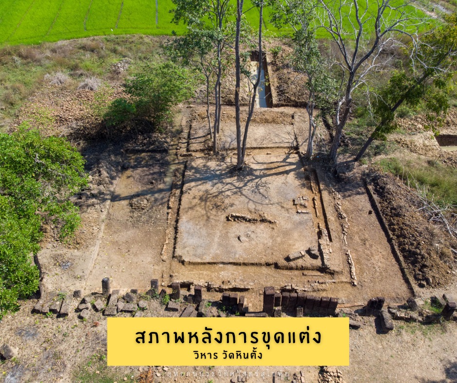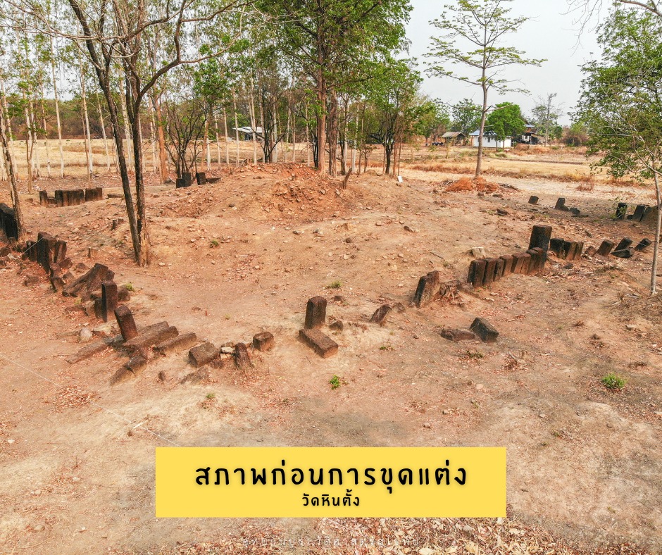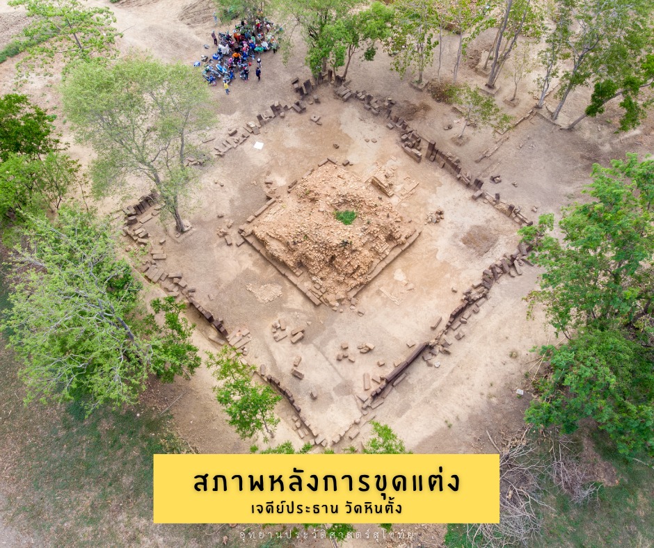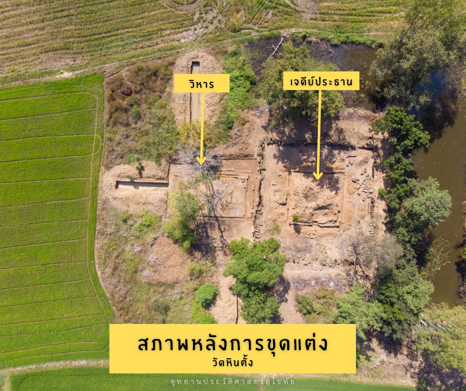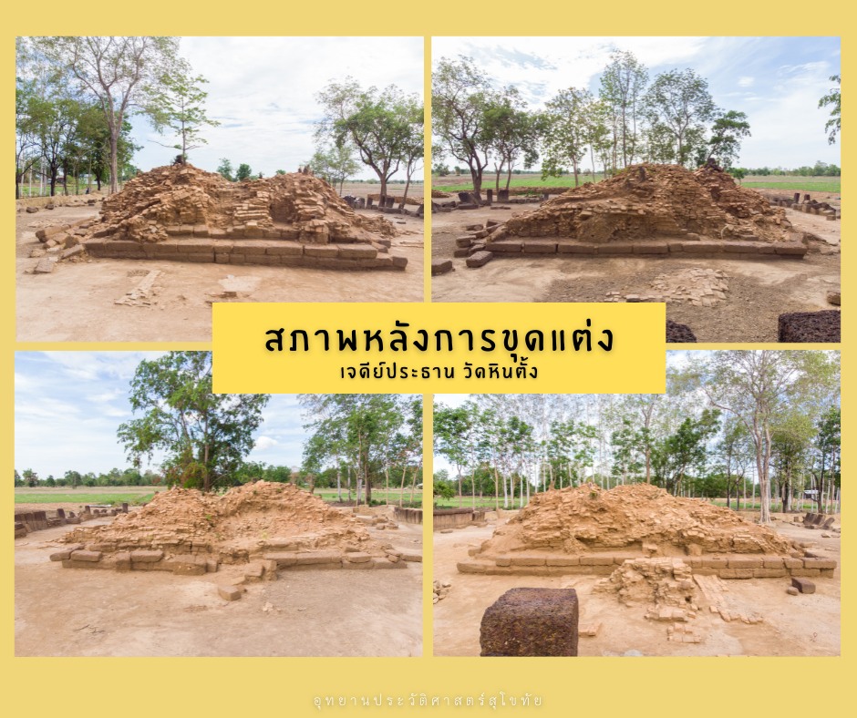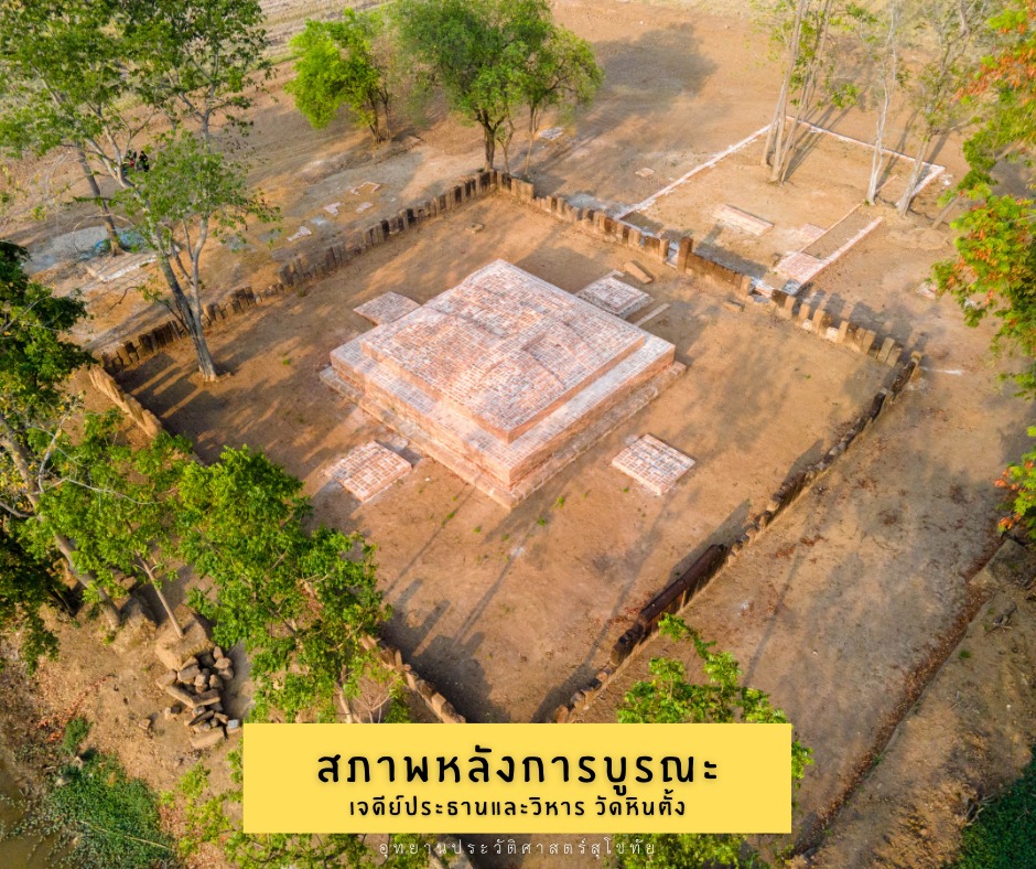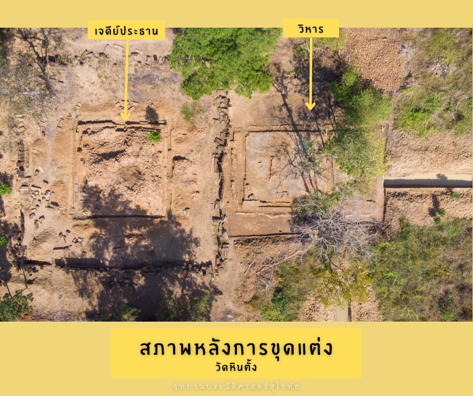 ในปี พ.ศ.๒๕๖๓ อุทยานประวัติศาสตร์สุโขทัยได้ดำเนินการขุดค้น ขุดแต่ง โบราณสถานวัดหินตั้ง ทำให้ทราบว่าเจดีย์ประธานของวัดฐานก่อด้วยศิลาแลงและอิฐ ในแผนผังสี่เหลี่ยมจัตุรัสมีขนาดกว้างด้านละประมาณ ๑๑.๓๐ เมตร แต่ด้วยการลักลอบขุดหาของตั้งแต่ครั้งอดีตทำให้ด้านบนของเจดีย์ได้ทำความเสียจนไม่สามารถสันนิษฐานรูปแบบทางสถาปัตยกรรมได้ นอกจากนี้ทิศทั้งสี่ของเจดีย์ประธานมีเจดีย์บริวารประจำทิศจำนวน ๔ องค์ หรือทิศละ ๑ องค์ (องค์ด้านทิศเหนือชำรุดเป็นอย่างมากจากการลักลอบขุดปรากฏร่องรอยเหลือเพียงเล็กน้อย) ล้อมรอบด้วยกำแพงแก้วทำจากแท่งศิลาแลงขนาดใหญ่ ปรากฏช่องประตูเข้า-ออกทางด้านทิศตะวันออกและด้านทิศตะวันตก ซึ่งการก่อสร้างกำแพงแก้วด้วยศิลาแลงขนาดใหญ่นี้ปรากฏหลักฐานการสร้างในลักษณะคล้ายกันกับโบราณสถานหลายแห่งตามแนวถนนพระร่วง อาทิเช่น โบราณสถานวัดโบสถ์เมืองบางขลัง, โบราณสถานวัดใหญ่ชัยมงคลเมืองบางขลัง รวมถึงโบราณสถานอีกหลายแห่งในเมืองศรีสัชนาลัยด้วย ทางด้านทิศตะวันออกนอกกำแพงแก้ว ปรากฏแนวอาคารสันนิษฐานว่าเป็นวิหารผนังก่ออิฐพื้นอัดด้วยดิน