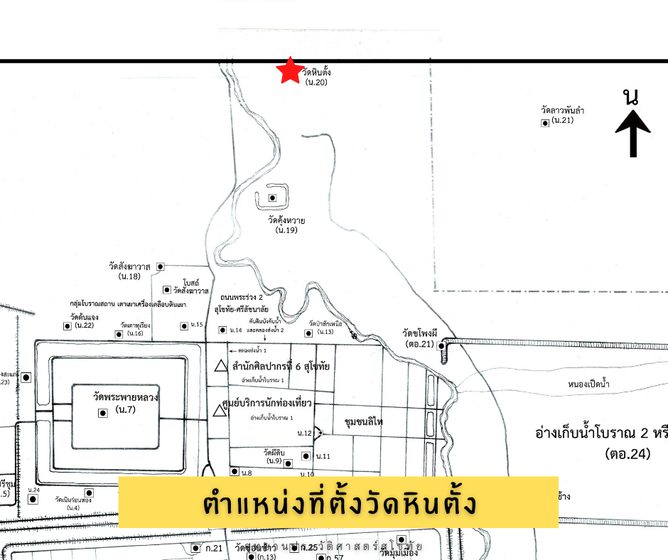 โบราณสถานวัดหินตั้งหรือโบราณสถานร้าง น.๒๐ ตั้งอยู่นอกกำแพงเมืองด้านทิศเหนือ ห่างจากประตูศาลหลวงทางทิศเหนือประมาณ ๓ กิโลเมตร โดยอยู่ริมฝั่งลำคลองแม่ลำพันด้านฝั่งตะวันออก ข้อมูลจากหนังสือทำเนียบโบราณสถานอุทยานประวัติศาสตร์สุโขทัย ฉบับปรับปรุง พุทธศักราช ๒๕๖๑ ได้อธิบายถึงสภาพก่อนการขุดค้นทางโบราณคดีว่า วัดหินตั้ง มีสภาพถูกทิ้งร้างเป็นเนินดิน สันนิษฐานในเบื้องต้นว่าประกอบไปด้วย ฐานเจดีย์ประธานก่อด้วยอิฐมีกำแพงแก้วล้อมรอบ ทำจากแท่งศิลาแลงขนาดใหญ่ ด้านทิศตะวันออกหรือด้านหน้าของฐานเจดีย์ปรากฎแนวฐานวิหารก่อด้วยอิฐ และคูน้ำ ล้อมรอบโบราณสถาน ปัจจุบันคูน้ำบางส่วนตื้นเขินและเสื่อมสภาพ