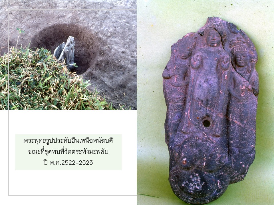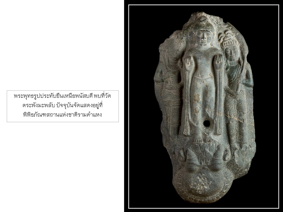 พระพุทธรูปประทับยืนเหนือพนัสบดีองค์นี้พบที่วัดตระพังมะพลับ (วัดตระพังพลับ, โบราณสถานร้าง ก.38, AT.C4) ตั้งอยู่ห่างจากประตูอ้อมาทางทิศตะวันออกประมาณ 300 เมตร โบราณสถานภายในวัดประกอบด้วยฐานวิหารก่ออิฐ และฐานเจดีย์รายขนาดเล็กก่ออิฐจำนวน 6 ฐาน โดยประติมากรรมที่พบมีลักษณะเป็นพระพุทธเจ้าประทับยืนยกพระหัตถ์ทั้งสองข้างแสดงปางแสดงธรรม ครองจีวรห่มคลุมแนบพระวรกาย พระพักตร์แบน พระขนงทั้งสองต่อกันเป็นรูปปีกกา พระเนตรโปน พระนาสิกโด่ง พระโอษฐ์หนา มีบุคคลยืนขนาบทั้งสองข้าง ด้านล่างคือ พนัสบดีที่ทำหน้าที่เป็นฐานรองพระพุทธเจ้า ซึ่งเชื่อว่าเป็นการรวมกันของสัตว์ทั้งสามคือ หงส์ โค และครุฑ ทั้งนี้ประติมากรรมพระพุทธรูประทับยืนเหนือพนัสบดีนั้นเป็นเอกลักษณ์พิเศษของศิลปะทวารวดี ซึ่งเหตุที่ประติมากรรมชิ้นนี้มาพบที่โบราณสถานในเมืองสุโขทัยนั้น สันนิษฐานได้ว่าอาจมีการเคลื่อนย้ายมา เนื่องด้วยขนาดของประติมากรรมมีขนาดไม่ใหญ่มากนัก
