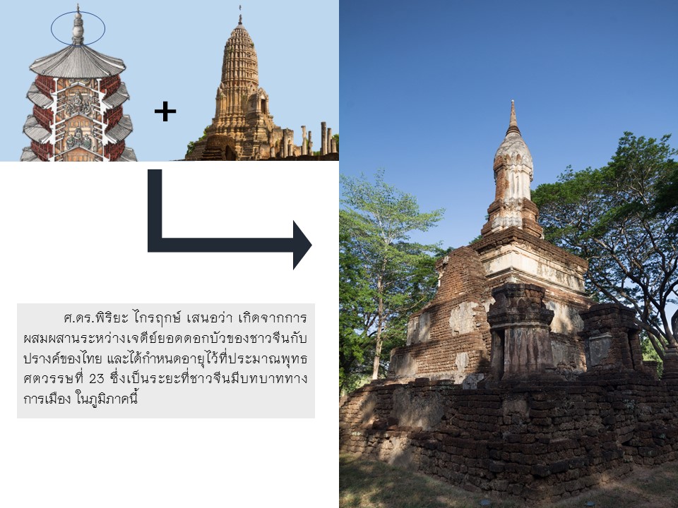 ศ.ดร.พิริยะ ไกรฤกษ์ เรียกเจดีย์ทรงนี้ว่า ปรางค์ยอดบัว ได้เสนอทฤษฎีที่ว่า เจดีย์ยอดดอกบัวตูมนี้ เกิดจากการผสมผสานระหว่างเจดีย์ยอดดอกบัวของชาวจีนที่ใช้สำหรับบรรจุอัฐิกับปรางค์ของไทย และได้กำหนดอายุไว้แตกต่างไปจากเดิมที่ประมาณพุทธศตวรรษที่ 23 ในช่วงสมัยพระเจ้าท้ายสระ ซึ่งเป็นระยะที่ชาวจีนมีบทบาททางการเมืองในภูมิภาคนี้