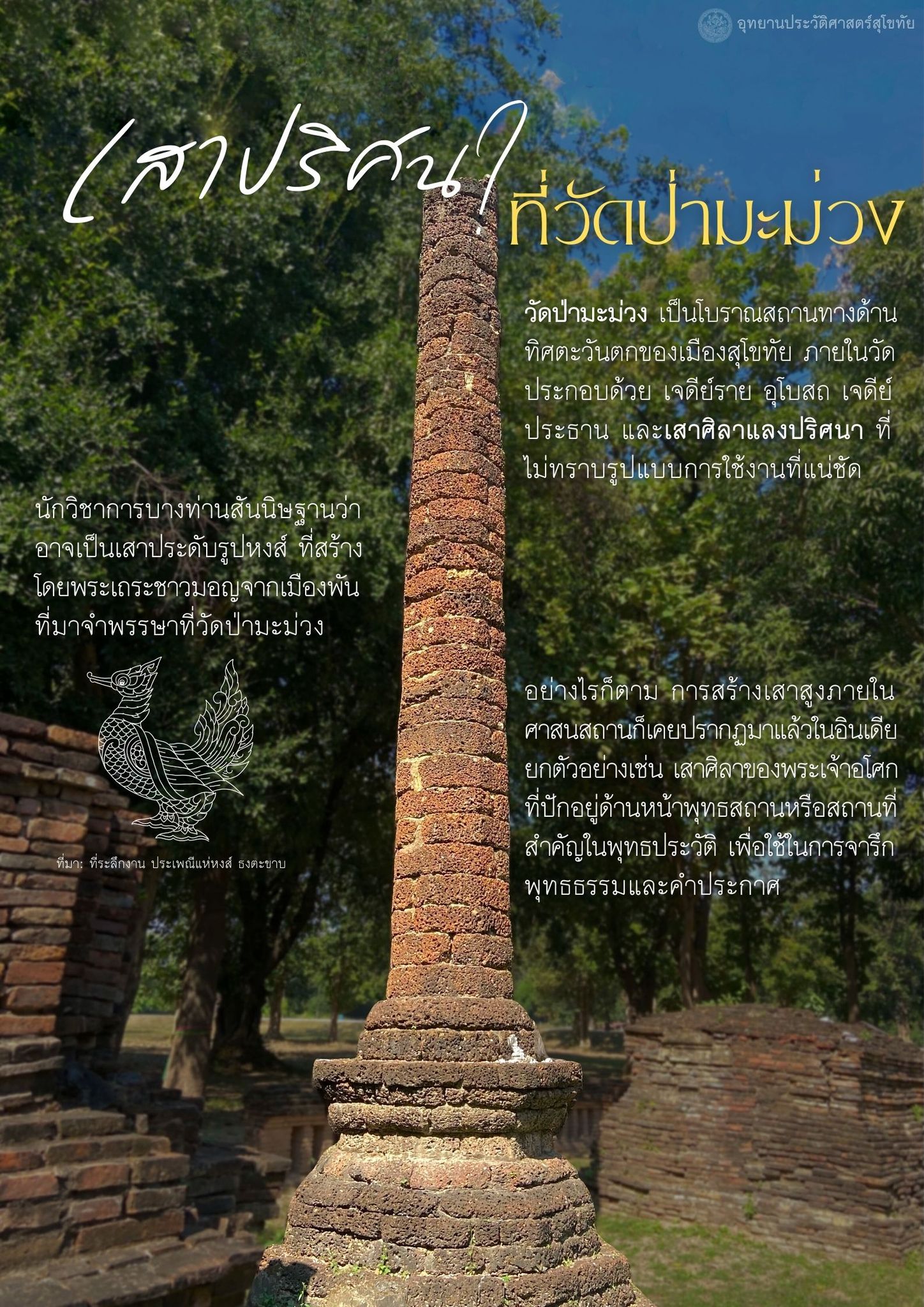 วัดป่ามะม่วง เป็นโบราณสถานด้านทิศตะวันตกของเมืองสุโขทัย มีการค้นพบศิลาจารึกที่กล่าวถึงวัดแห่งหนึ่งที่สร้างขึ้นที่ป่ามะม่วง เมื่อ พ.ศ. ๑๙๐๔ ได้มีการอาราธนา ‘มหาสามีสังฆราช’ จากเมืองพัน (มอญ) มาจำพรรษา โดยในเวลาต่อมาพระเถระรูปนี้ได้ทำพิธีบวชให้แก่พระมหาธรรมราชาที่ ๑ (พญาลิไท) ภายในวัดประกอบด้วยอุโบสถ เจดีย์ราย และเจดีย์ประธาน นอกจากนี้ภายในวัดยังมีเสาศิลาแลงตั้งอยู่ด้านหลังเจดีย์ประธาน ปัจจุบันยังไม่ทราบรูปแบบการใช้งานที่แน่ชัด แต่นักวิชาการบางท่านสันนิษฐานว่า อาจเป็นเสาประดับรูปหงส์ที่สร้างขึ้นโดยพระเถระชาวมอญจากเมืองพันที่มาจำพรรษาที่วัดป่ามะม่วง
