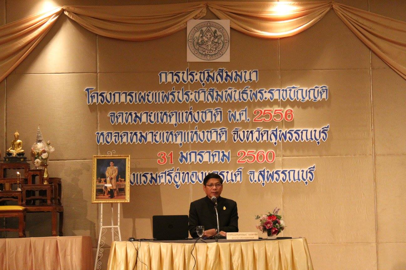 เมื่อวันที่ ๓๑ มกราคม ๒๕๖๐ หอจดหมายเหตุแห่งชาติ จังหวัดสุพรรณบุรี จัดกิจกรรมสัมมนาใน “โครงการเผยแพร่ประชาสัมพันธ์พระราชบัญญัติจดหมายเหตุแห่งชาติ พ.ศ.๒๕๕๖” เพื่อเผยแพร่และประชาสัมพันธ์พระราชบัญญัติจดหมายเหตุแห่งชาติ พ.ศ.๒๕๕๖ ให้แก่หน่วยงานราชการในจังหวัดสุพรรณบุรีและจังหวัดอ่างทอง รวมถึงเสริมสร้างความร่วมมือระหว่างหน่วยงานภาครัฐในส่วนภูมิภาคกับหอจดหมายเหตุแห่งชาติ จังหวัดสุพรรณบุรี โดยมีว่าที่ร้อยตรีสุพีร์พัฒน์ จองพานิช ผู้ว่าราชการจังหวัดสุพรรณบุรีเป็นประธานเปิดกิจกรรมสัมมนา ณ ห้องแกรนด์บอลรูม โรงแรมศรีอู่ทองแกรนด์ จังหวัดสุพรรณบุรี ทั้งนี้ มี่ผู้ให้ความสนใจเข้าร่วมกิจกรรมมากถึง ๒๓๙ คน