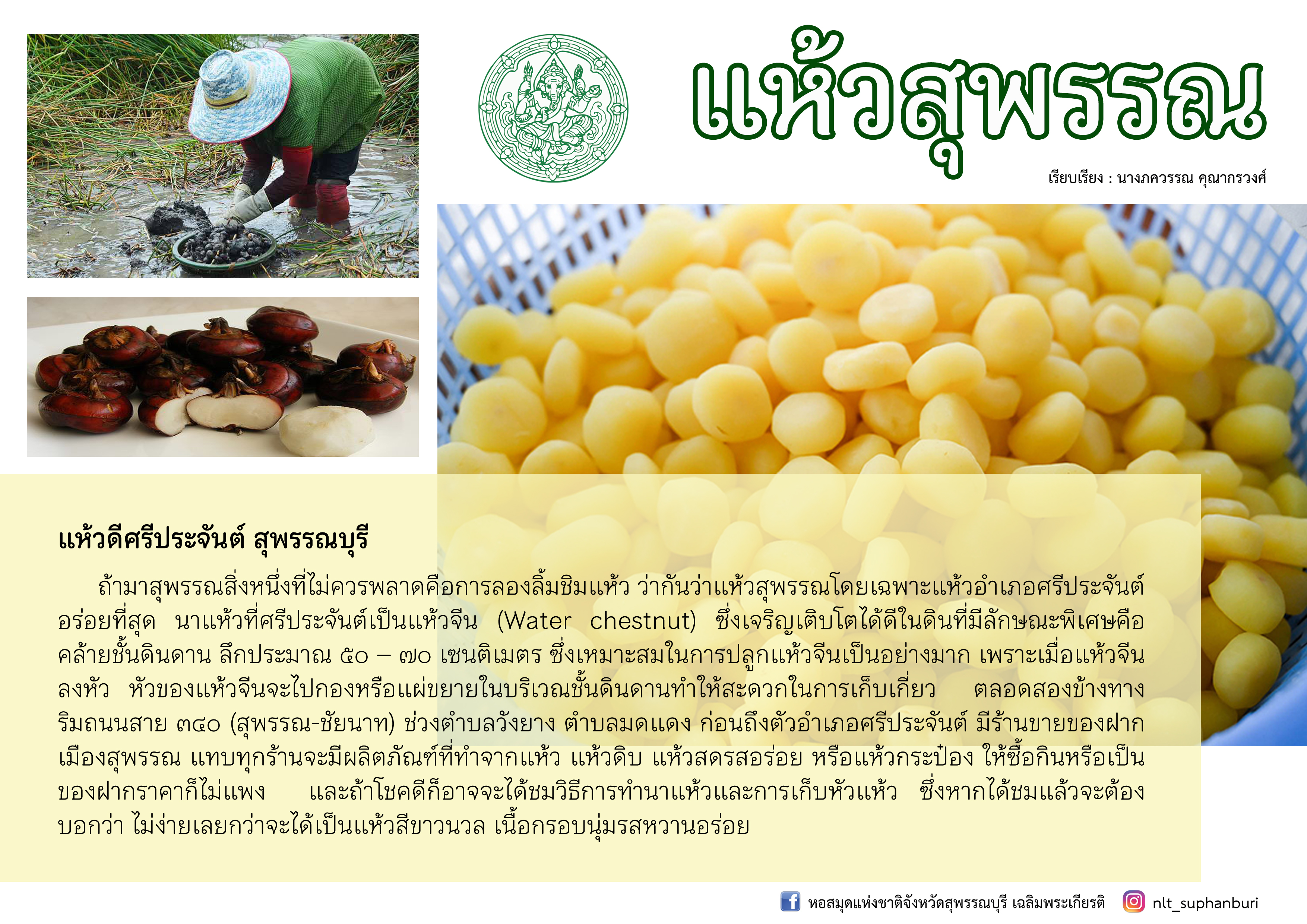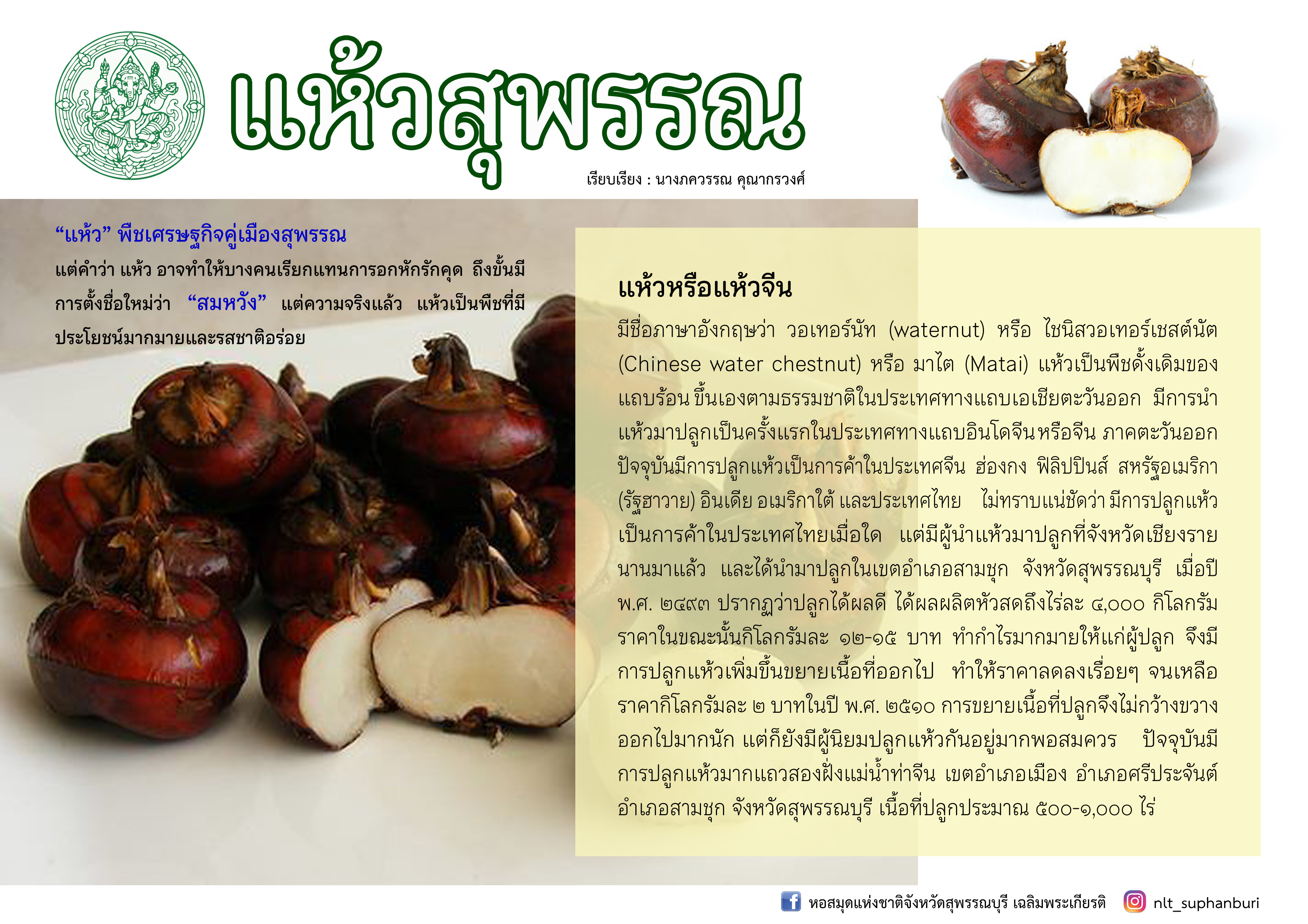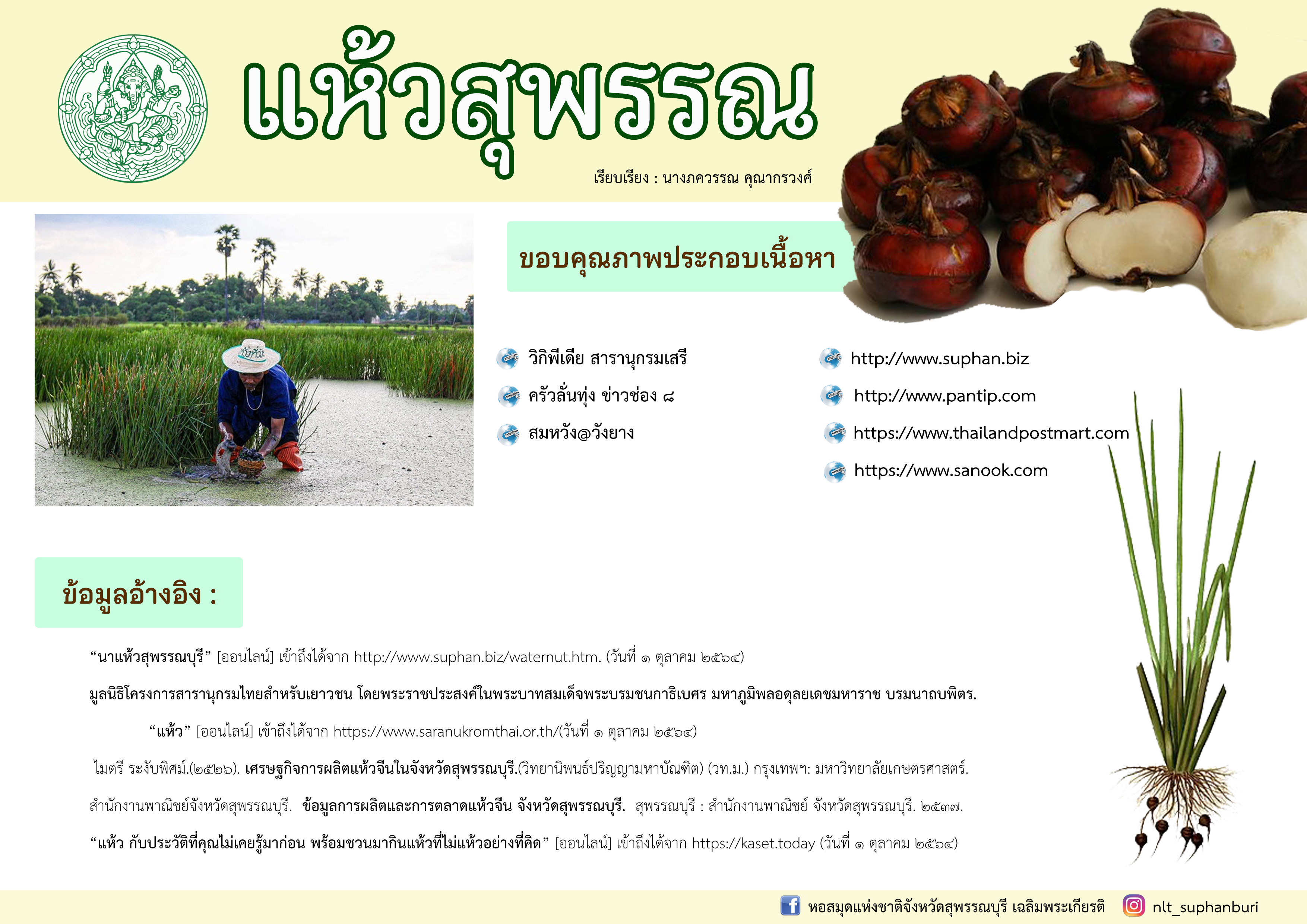 “นาแห้วสุพรรณบุรี” [ออนไลน์] เข้าถึงได้จาก http://www.suphan.biz/waternut.htm. (วันที่ ๑ ตุลาคม ๒๕๖๔)