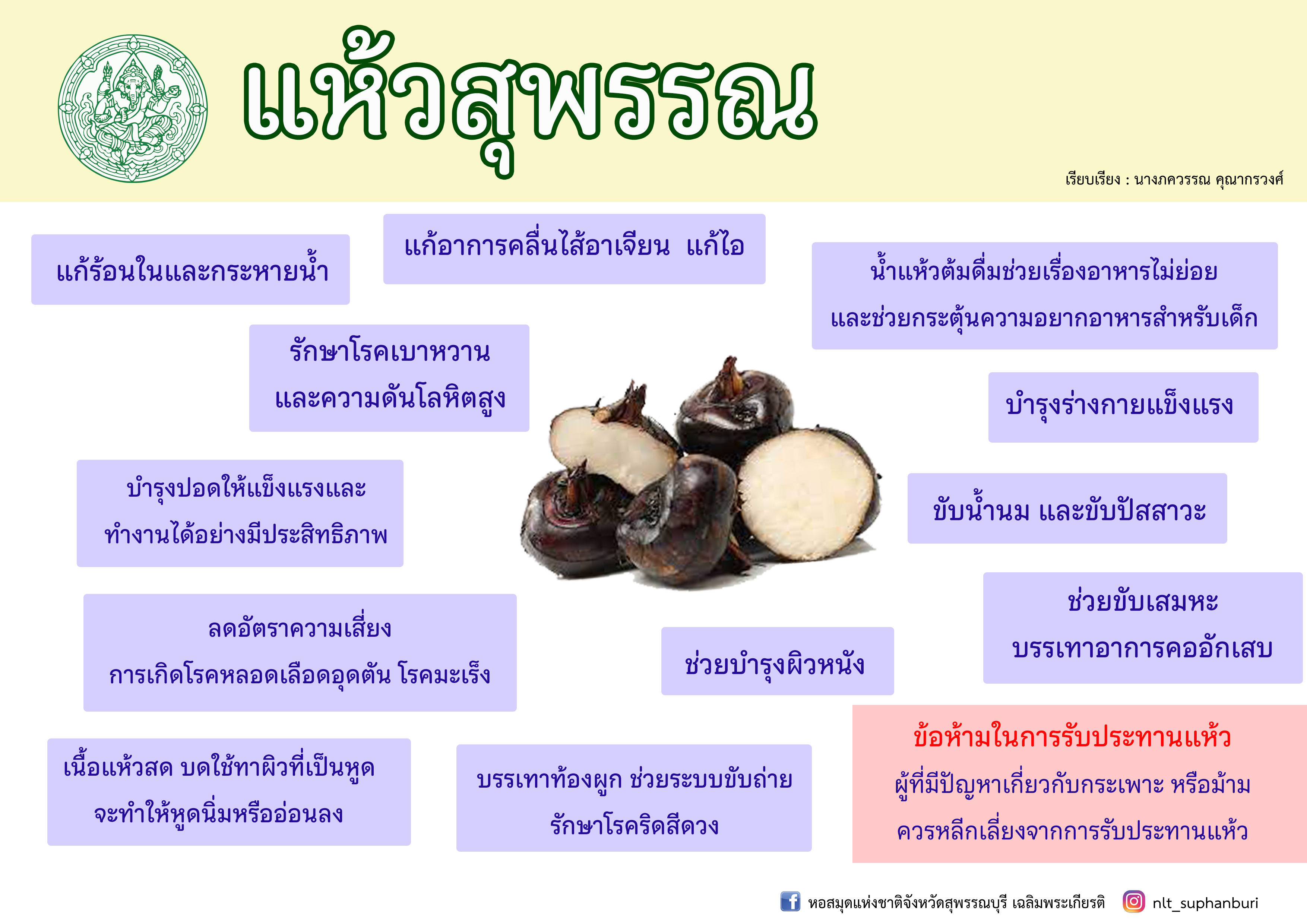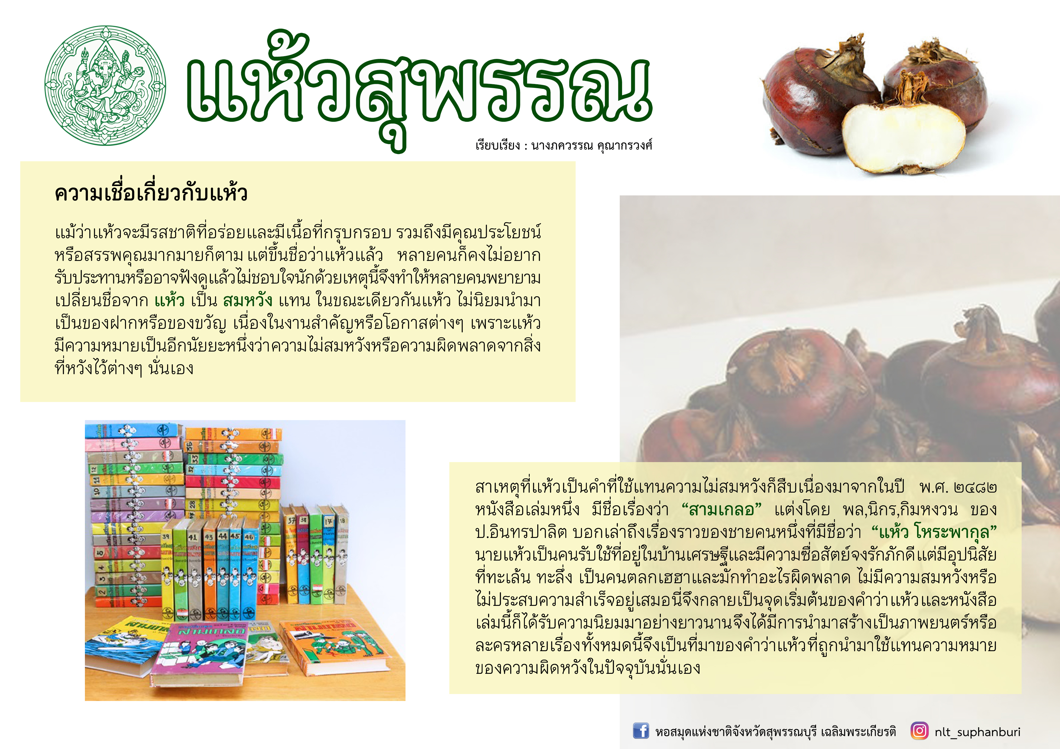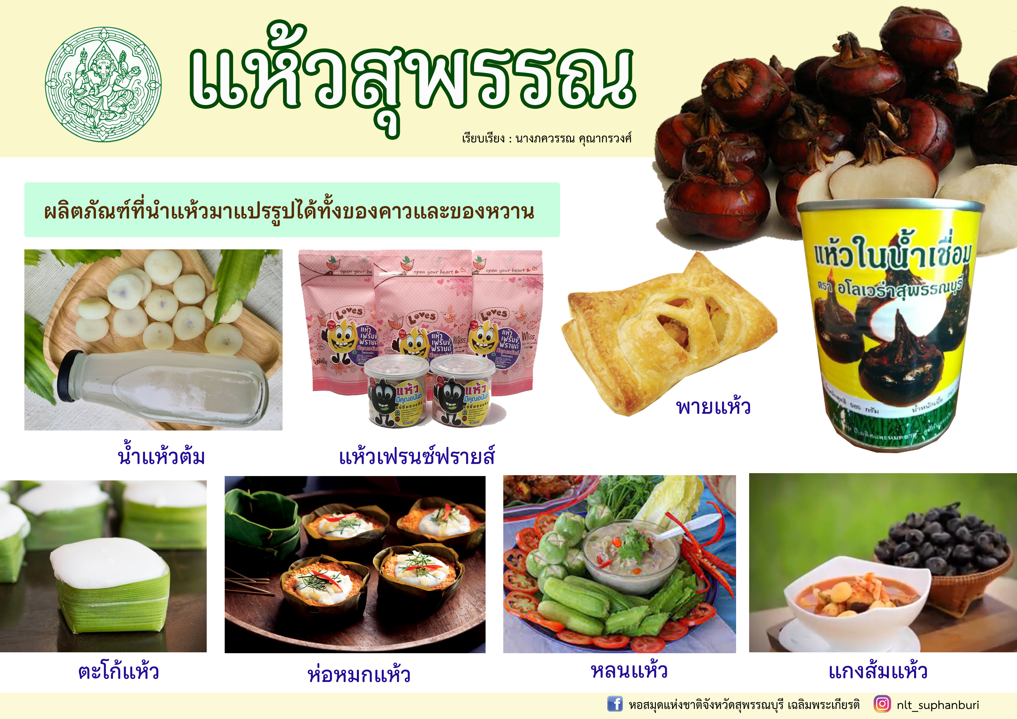 “นาแห้วสุพรรณบุรี” [ออนไลน์] เข้าถึงได้จาก http://www.suphan.biz/waternut.htm. (วันที่ ๑ ตุลาคม ๒๕๖๔)