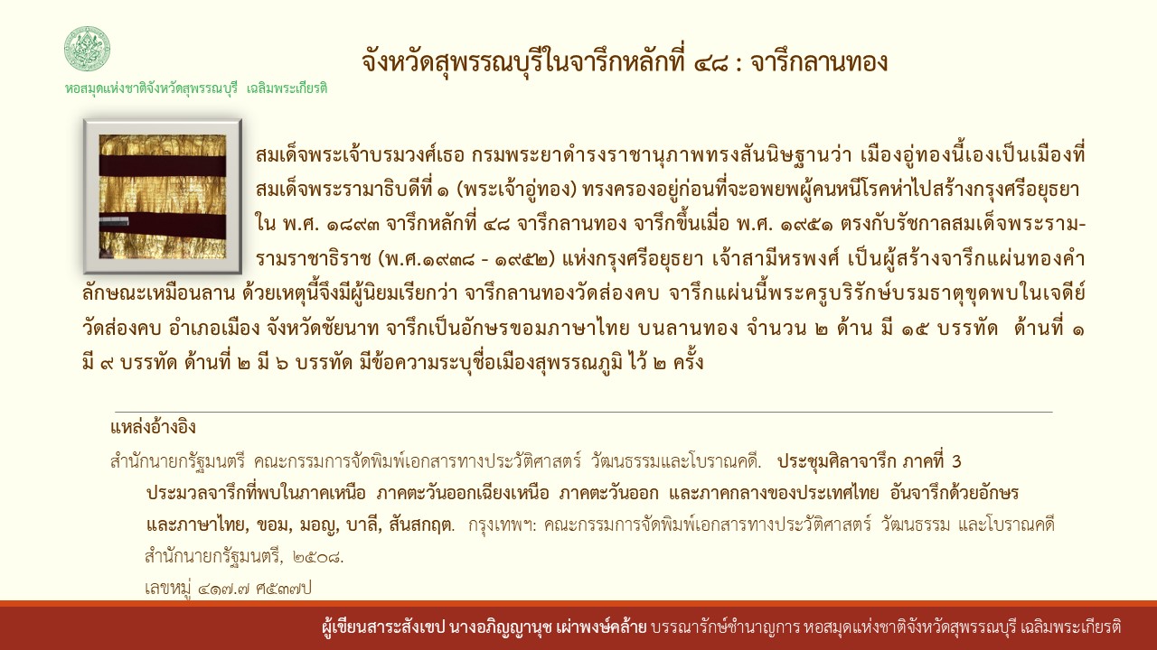 องค์ความรู้สุพรรณบุรี เรื่อง จังหวัดสุพรรณบุรีในจารึกหลักที่ ๔๘ : จารึกลานทอง